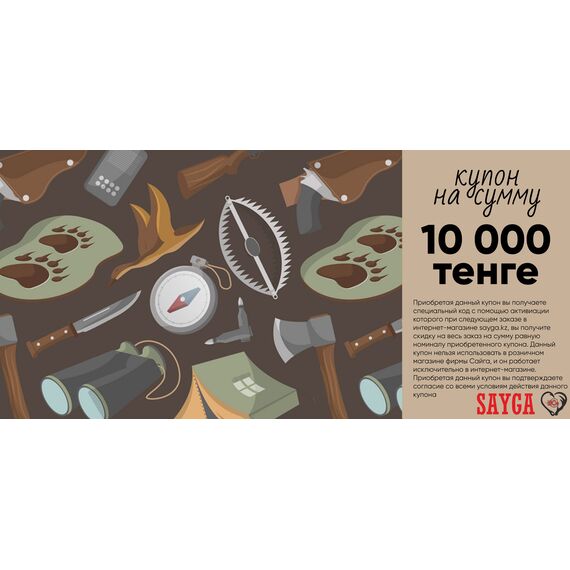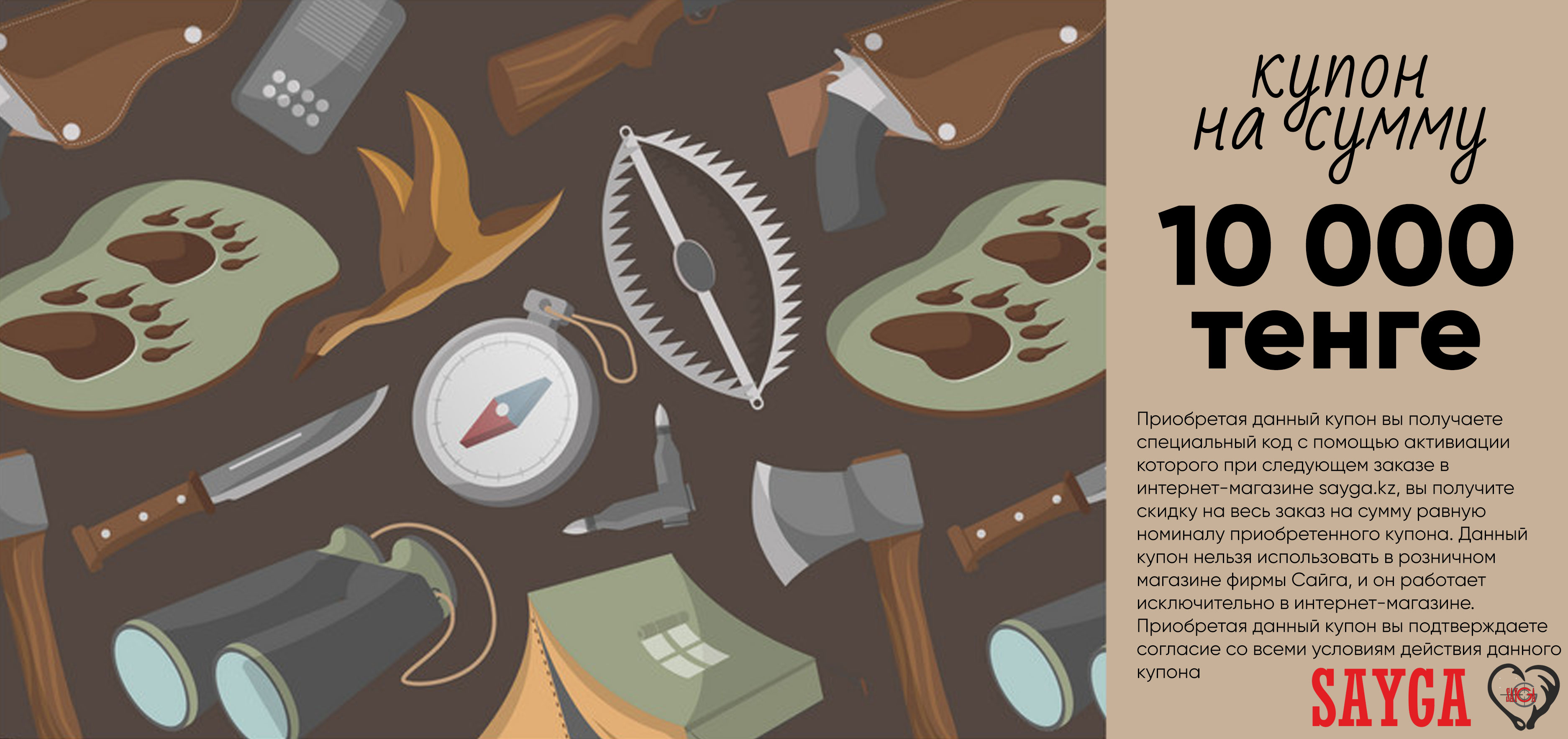 Приобретая данный купон вы получаете специальный код с помощью активиации которого при следующем заказе в интернет-магазине sayga.kz, вы получите скидку на весь заказ на сумму равную номиналу приобретенного купона. Данный купон нельзя использовать в розничном магазине фирмы Сайга, и он работает исключительно в интернет-магазине. Приобретая данный купон вы подтверждаете согласие со всеми условиям действия данного купона