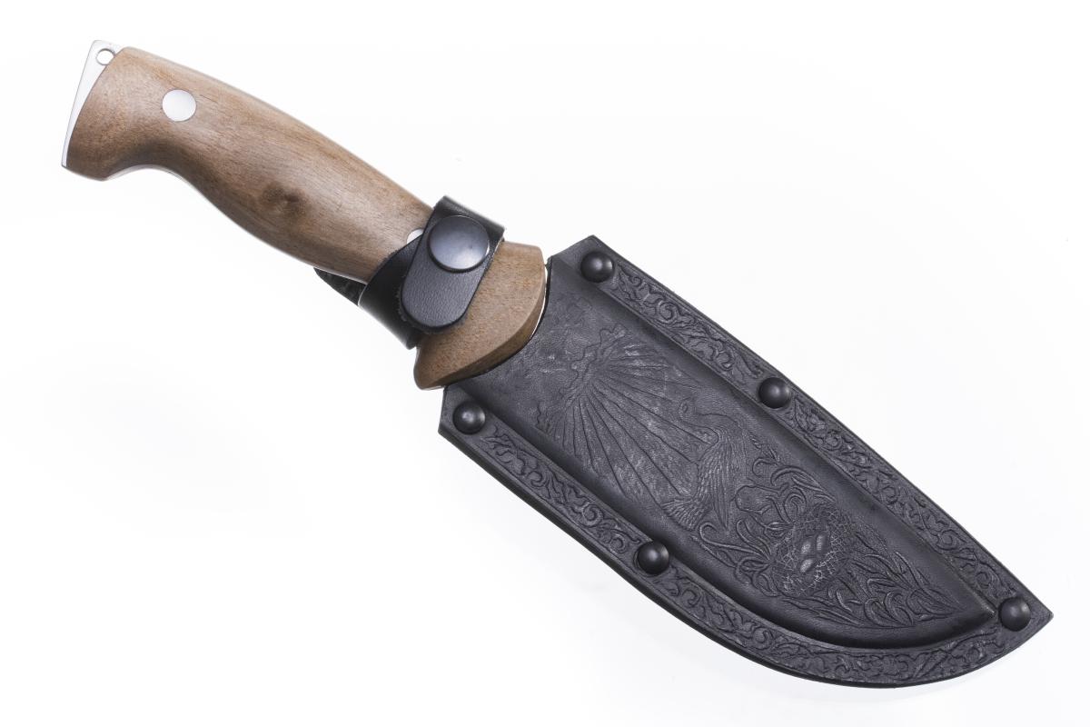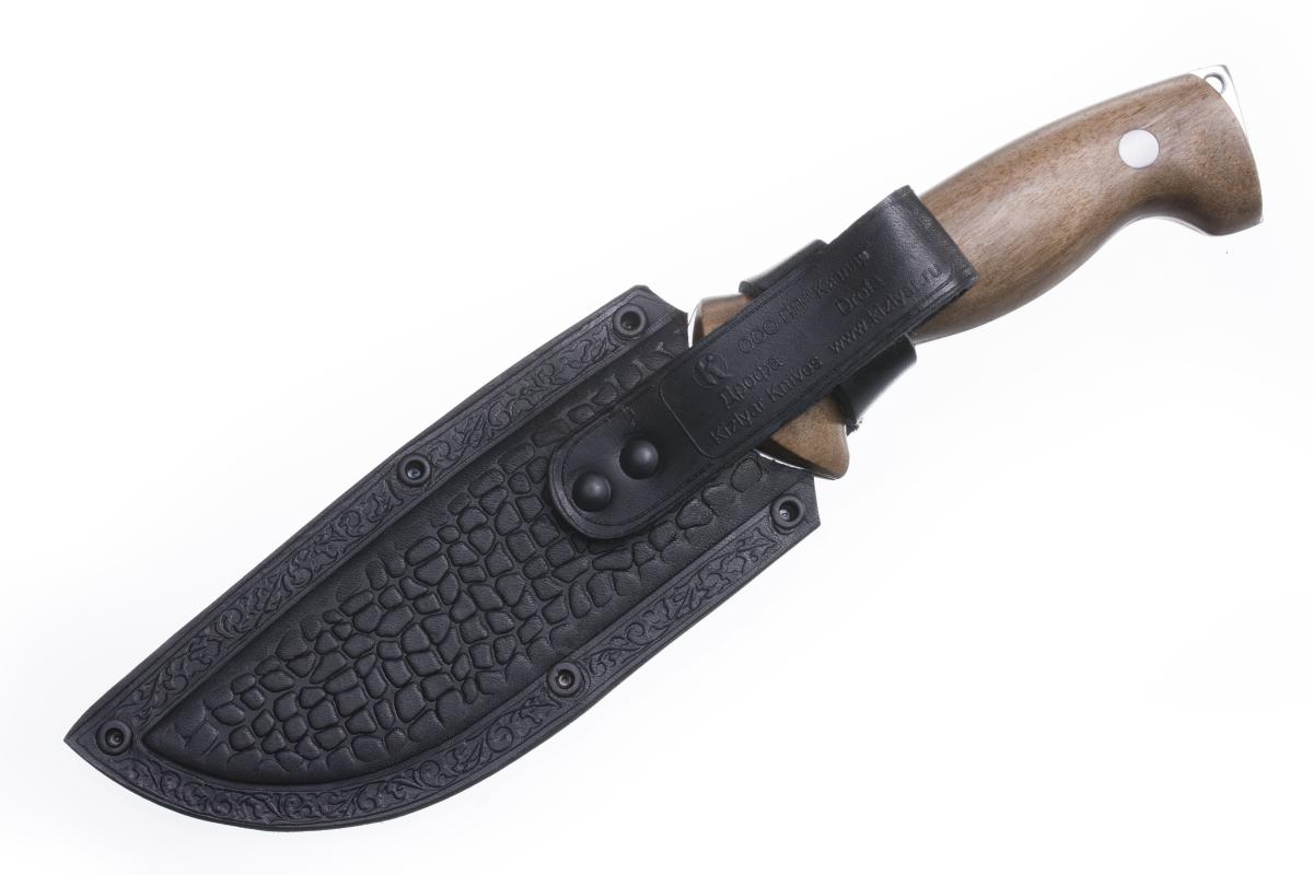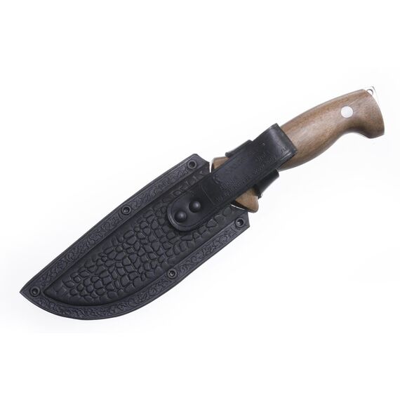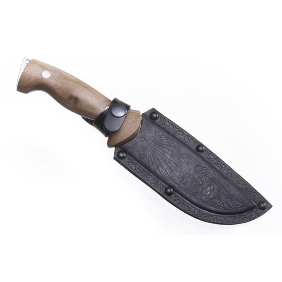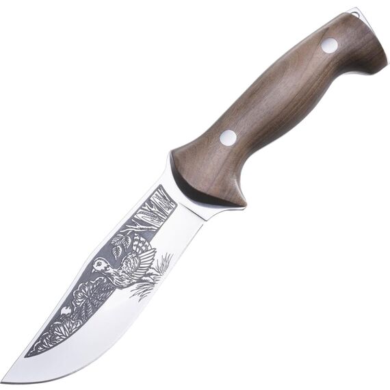Рукоять из натурального кавказского ореха - ее изящество и эргономичность заслуживают высшей оценки. Если Вы однажды возьмете его в руки - Вам больше не захочется расставаться с ним, настолько он удобно и приятно лежит в руке. Клинок, выкованный из нержавеющей стали AUS-8, обладает совершенными линиями в каждом своем изгибе. Рисунок на клинке ножа выполнен вручную, при помощи метода двойного травления, что позволяет придать рисунку большую глубину и фактурность, добавляет последний штрих в изумительный облик этого ножа.