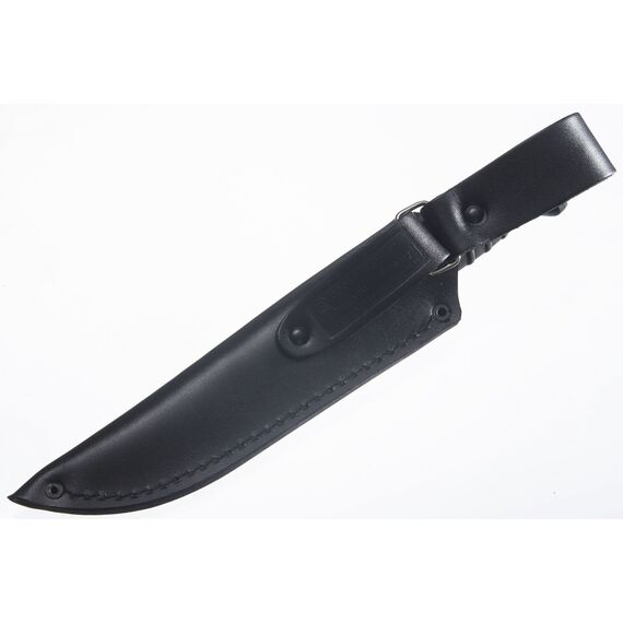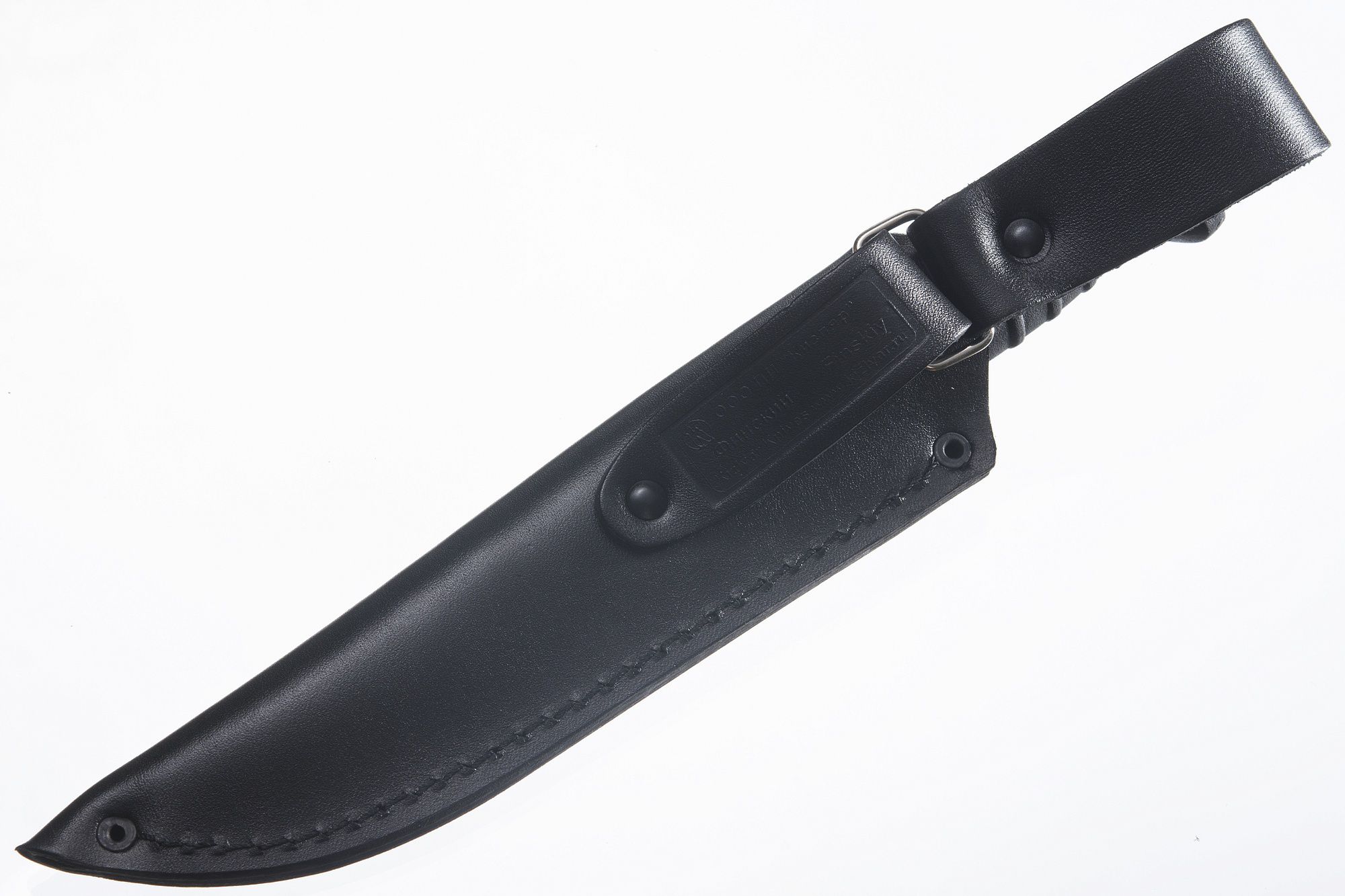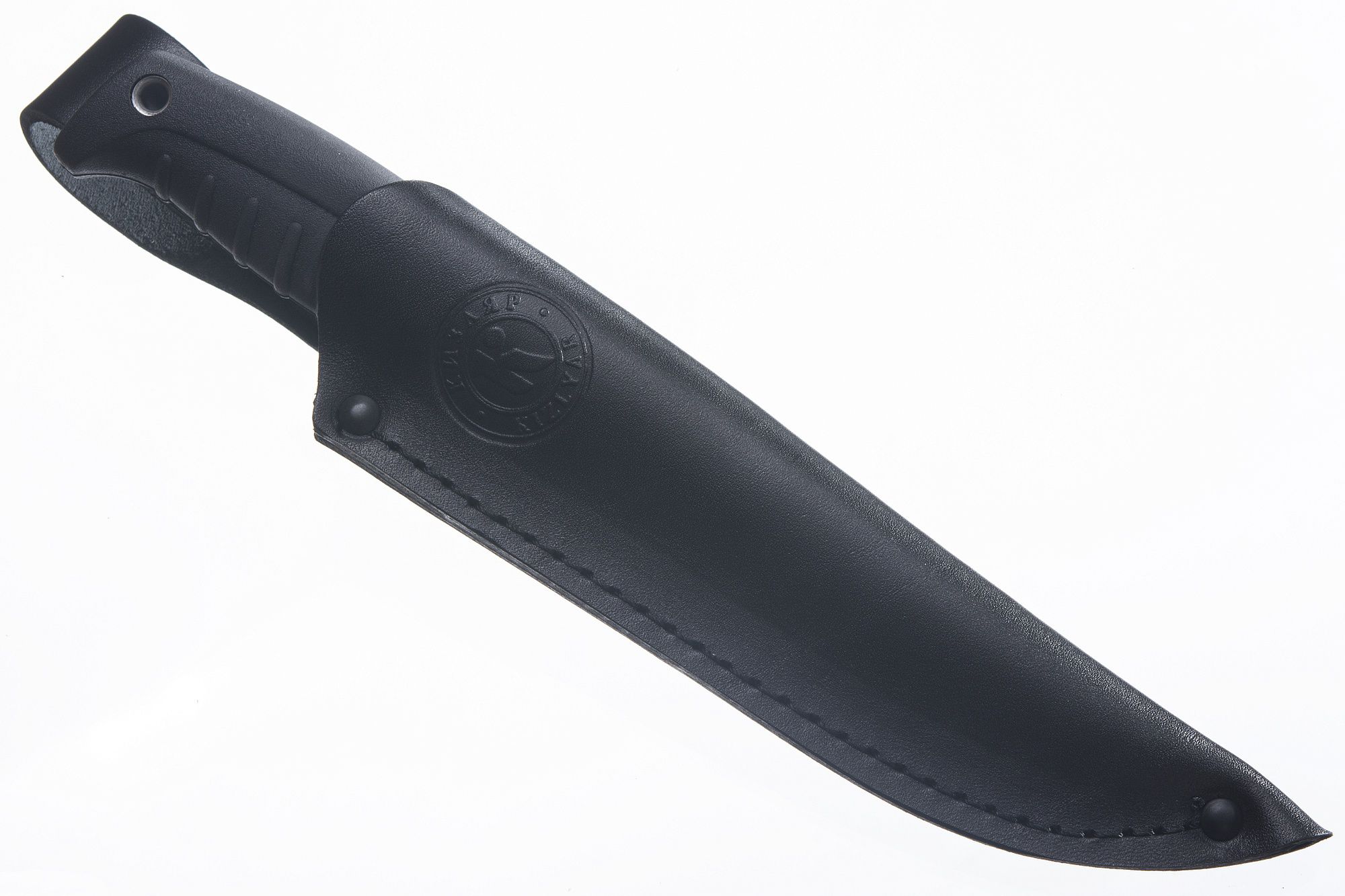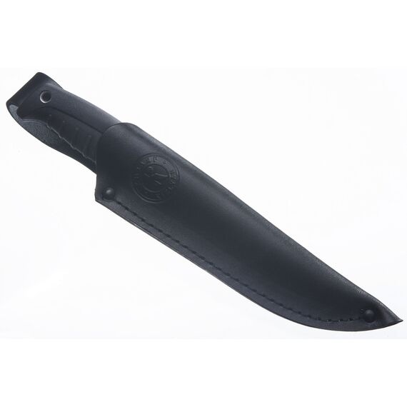 Нож "Финский" выполнен в скандинавском стиле. Клинок прямой формы с чуть опущенным острием. Спуски выполнены клином от обуха, а сам клинок сужается от рукояти к острию. Такая форма спусков очень удобна, получила хорошие отзывы наших покупателей и используется на многих наших моделях. Вариант «Финского» с эластроновой рукоятью отличается от базовой модели формой рукояти. Появился небольшой ограничитель рукояти и выступающие рифления на подпальцевой части. Рукоять стала более ухватистой, нож гораздо надежнее удерживается в руке. Этому способствуют и свойства эластомера по ощущениям напоминающего резину. Рукоять не скользит в руке даже во влажной среде. Отверстие для темляка оформлено развальцованной трубкой из нержавеющей стали.