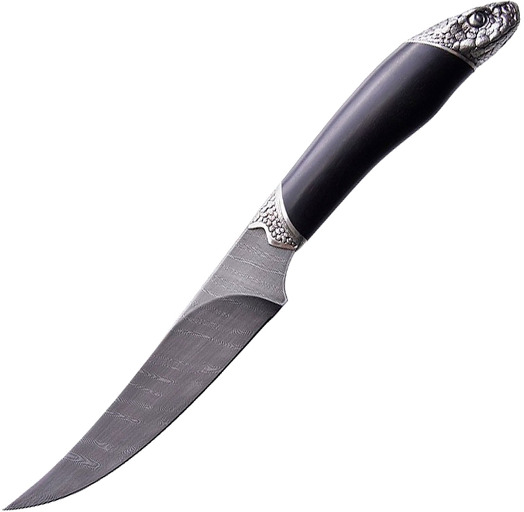 Рукоять ножа выполнена из чёрного дерева. Дерево является одним из самых традиционных и распространенных материалов для рукоятей ножей. Основным плюсом древесины является то, что, благодаря своей текстуре, она без особых усилий может принять практически любую художественную форму. Традиционно используется на охотничьих ножах.