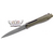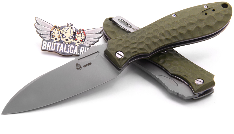 Обеспечение качественного реза и удобство при использовании – именно на это нацелен абрис и характерные элементы клинка Ponomar Folder. Режущая кромка плавно изгибается, что позволяет уверенно работать с любыми продуктами. Нарезать, шинковать и измельчать хоть с протягом, хоть перекатом от острия к пяте - его стихия. Пята клинка ограждает пальцы от соскальзывания на лезвие, она плавно переходит в рукоять, чем образует подпальцевую выемку. Горбинка на обухе снабжена насечкой и работает в качестве упора, причём работают оба её «склона», как в классическом, так и в глубоком хвате. В качестве финишной обработки применён stonewash, на плоскости спусков нанесены логотип имя и фирменный черепок. Упором при открытии служат фрезерованные углубления сложной формы, выполненные симметрично с обеих сторон.