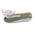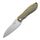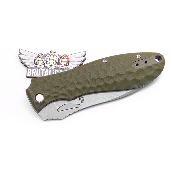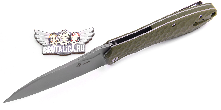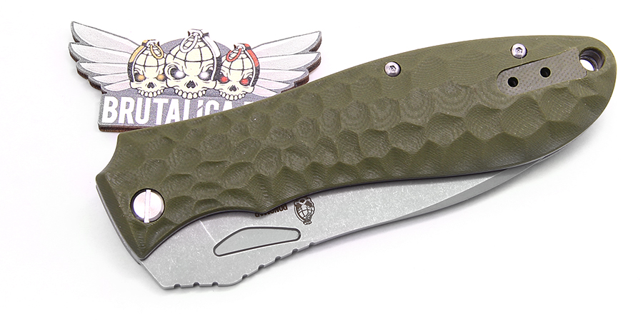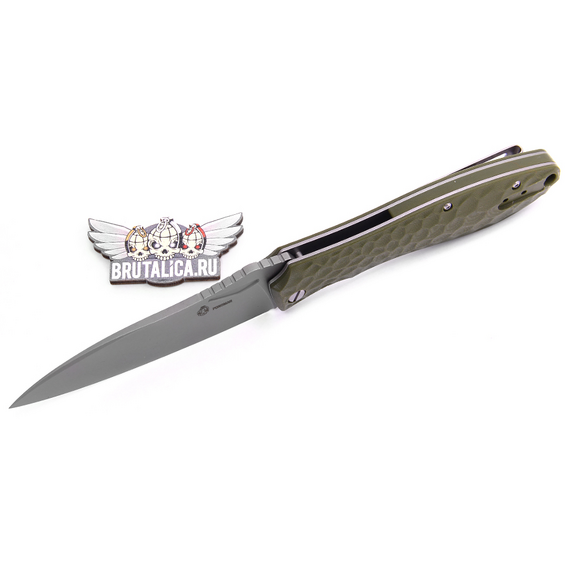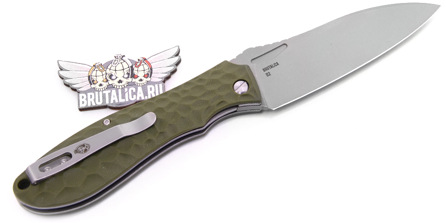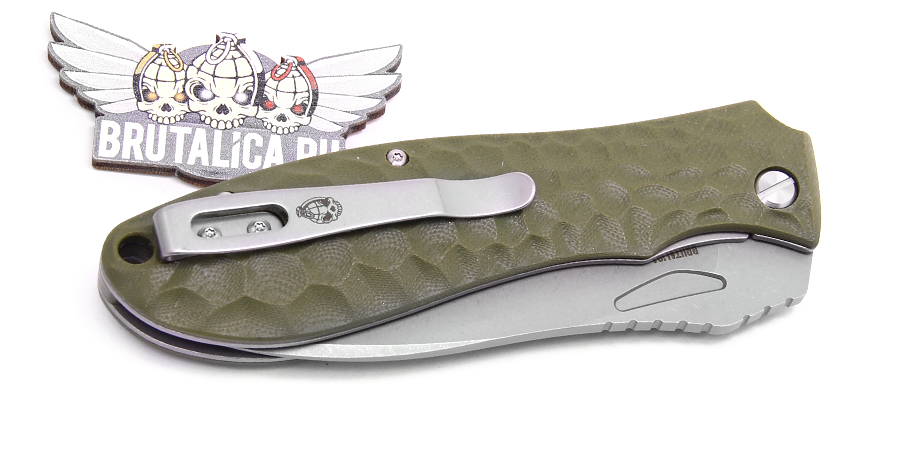 Честные стальные лайнеры разделены бонками и прикрыты довольно массивными плашками с выраженной фактурой. Накладки из композита G10 в данном случае имеют оливковый оттенок, фактура же - традиционный битый камень, что и на ощупь приятно, и скольжение исключает, и выглядит брутально и интересно. Крепятся накладки четырьмя винтами torx и осевым под прямой шлиц. Формы рукояти не особо вычурные, что характерно для ножей, которые должны работать часто и помногу, в них заложен необходимый и достаточный минимум эргономики, позволяющий подойти практически под любую ладонь и обеспечивать комфорт при работе. В самой крайней точке рукояти - навершии расположилось отверстие для темляка, клипса tip-up, может быть установлена на правую или левую сторону.