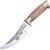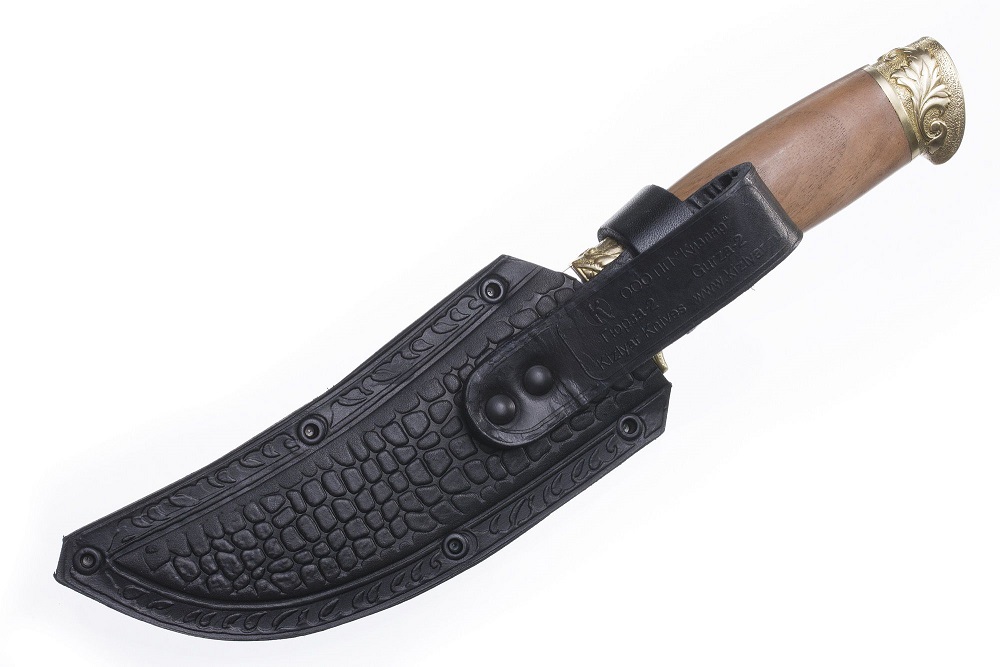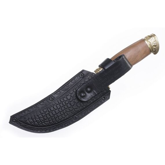 Рисунок на клинке ножа выполнен вручную, при помощи метода двойного травления, что позволяет придать рисунку большую глубину и фактурность. Гюрза-2 - один из первых ножей нашего производства. Нож не потерял за многие годы свою популярность благодаря своему уникальному внешнему виду и функциональным свойствам. Изогнутый клинок с подпальцевой выемкой на пяте. Рукоять из кавказского ореха. Поясные ножны из натуральной кожи. Плашки приклепаны к хвостовику.