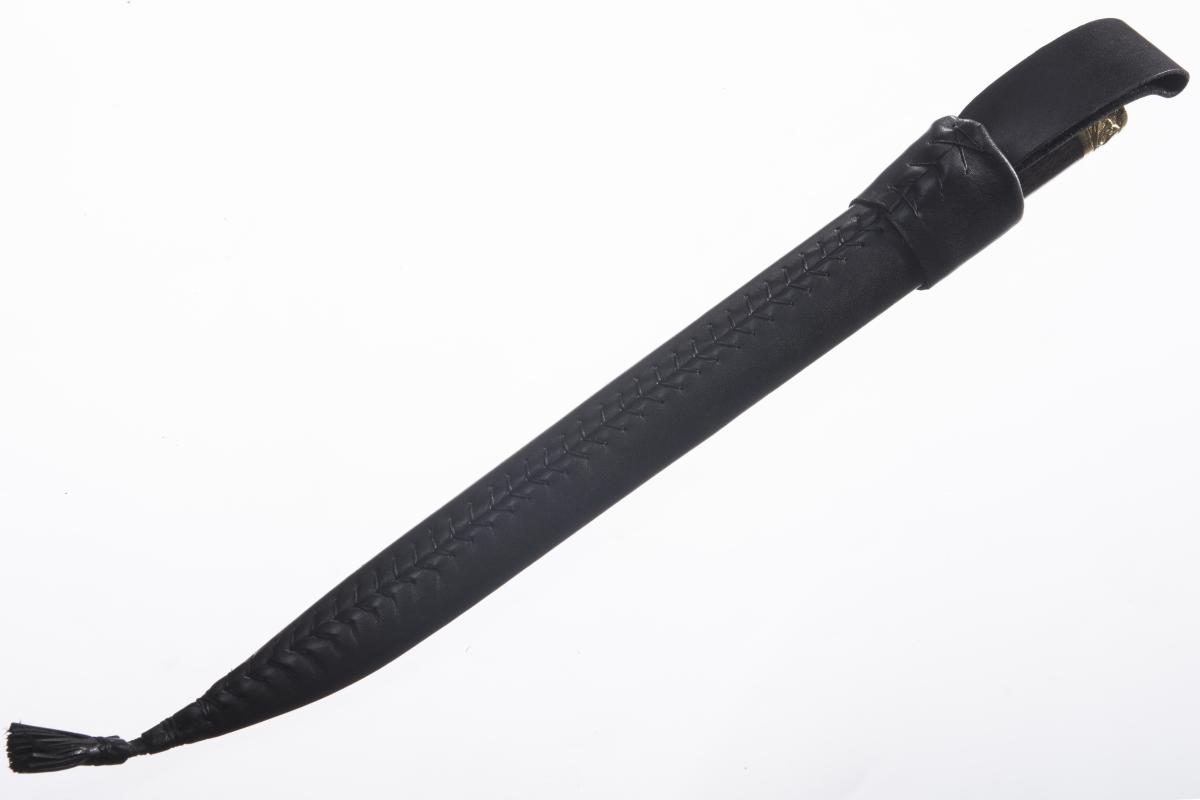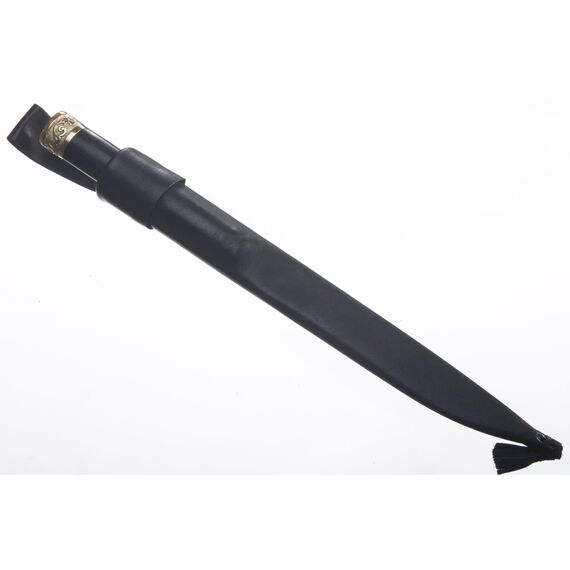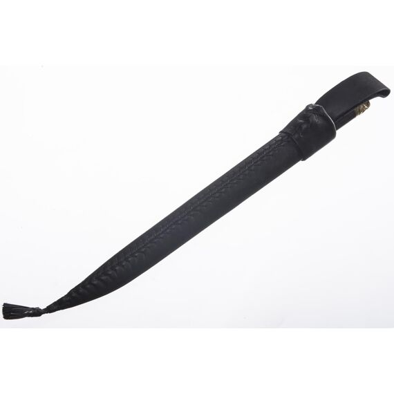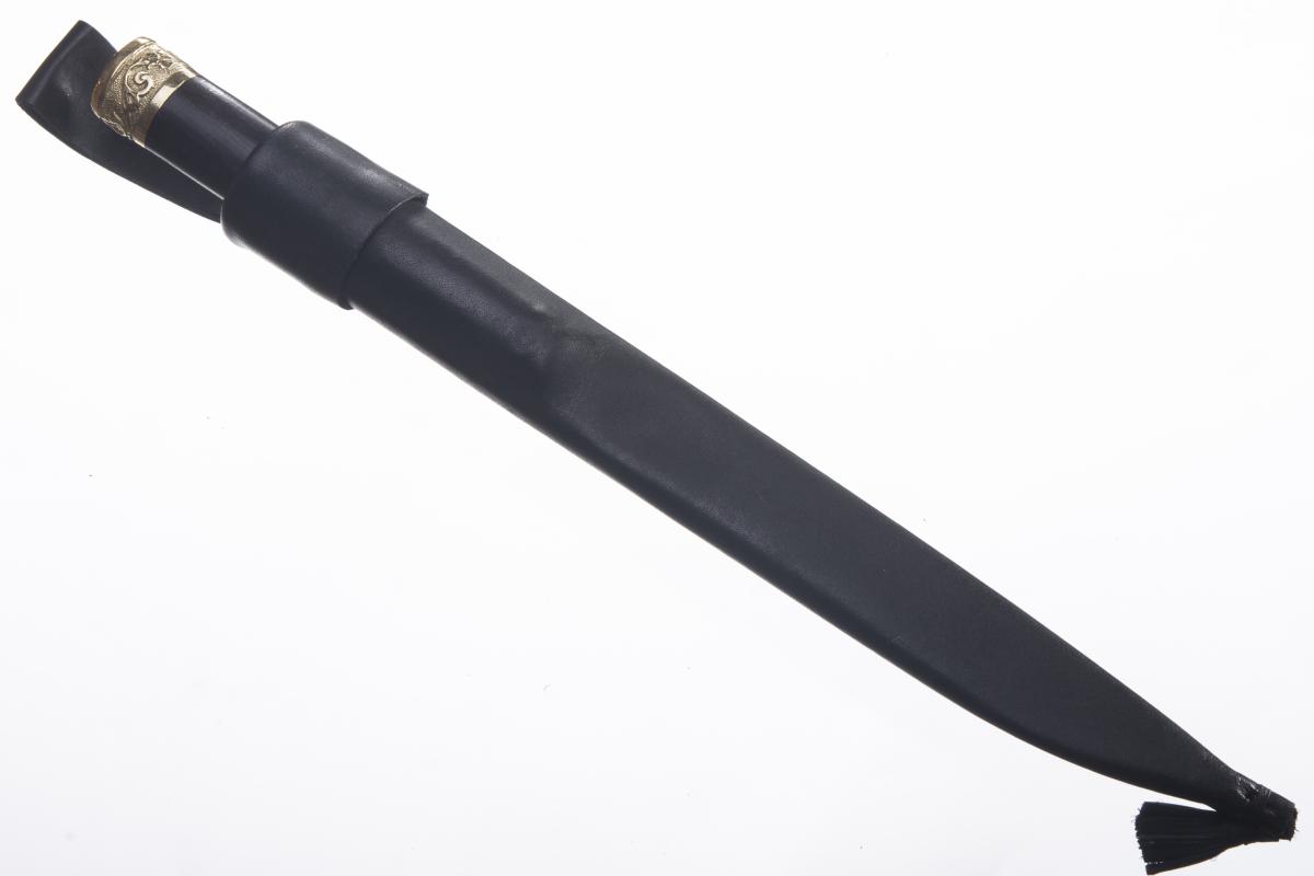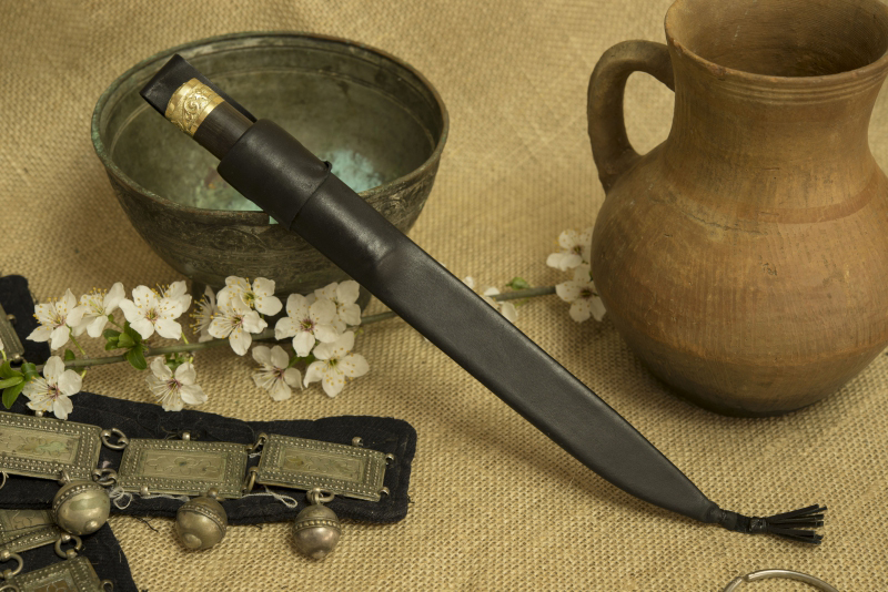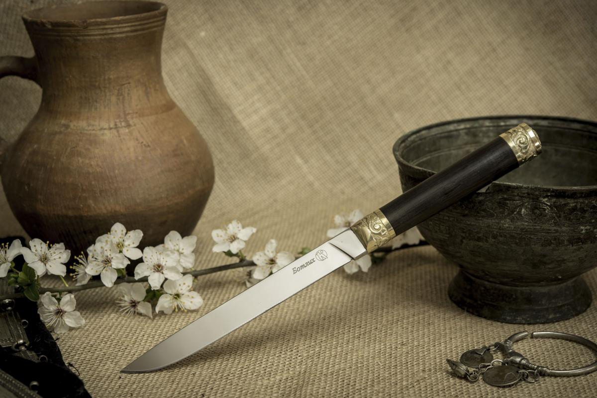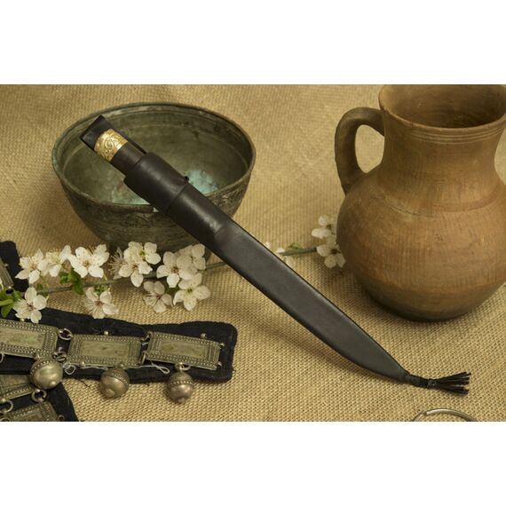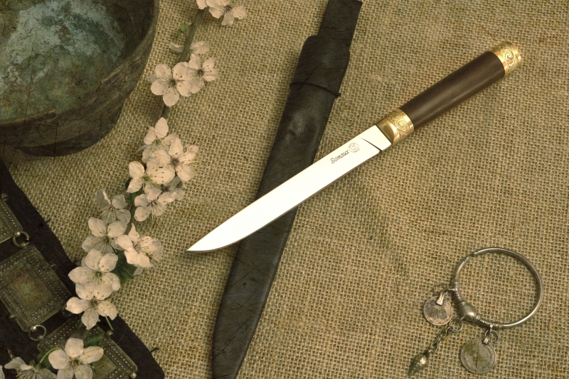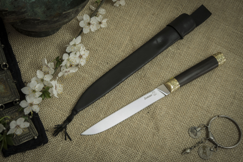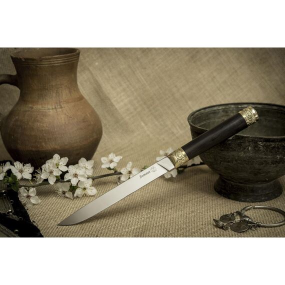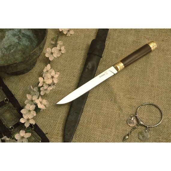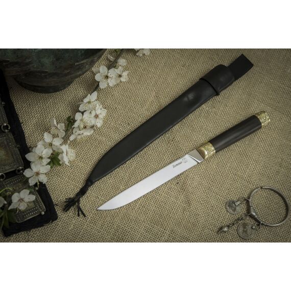 Нож "Ботлих" выполнен в стиле традиционных северо-кавказских ножей, которые принято носить на поясе. Клинок ножа выполнен из стали устойчивой к коррозии, которая закалена до 57-59 единиц по шкале HRC. Клинок имеет традиционную прямую форму и спуски от обуха. Нож имеет отличный и легкий рез. Длинное и тонкое лезвие хорошо справится с разделкой рыбы и приготовлением мяса для шашлыка. Рукоятка ножа выполнена из черного граба, монтаж всадной. Оковка и хвостовик рукояти выполнены из латуни и украшены резным орнаментом. Ножны имеют деревянный корпус, который обклеен натуральной кожей. Ножны имеют латунный наконечник и петлю для ношения на поясе. Нож плотно фиксируется в ножнах. Несмотря на свою внешнюю утонченность – перед вами отличный рабочий нож, который можно использовать во время выездов на природу. Благодаря латунным элементам нож выглядит очень презентабельно и отлично подойдет на роль подарочного ножа.