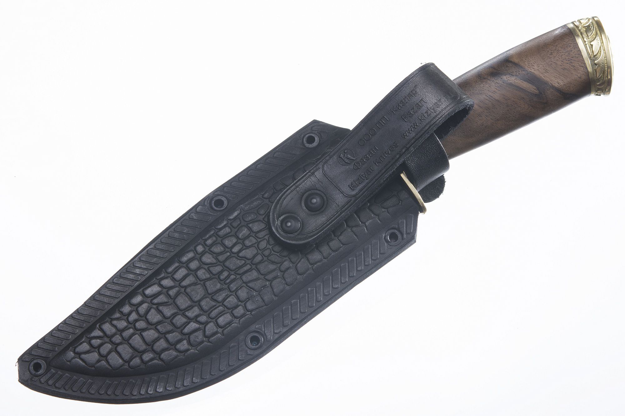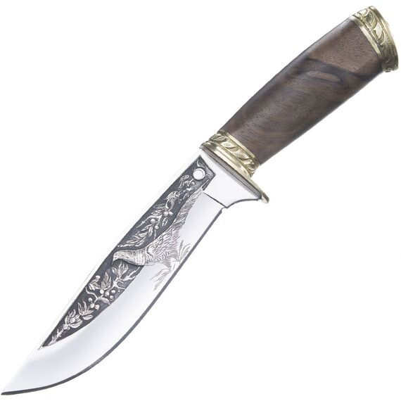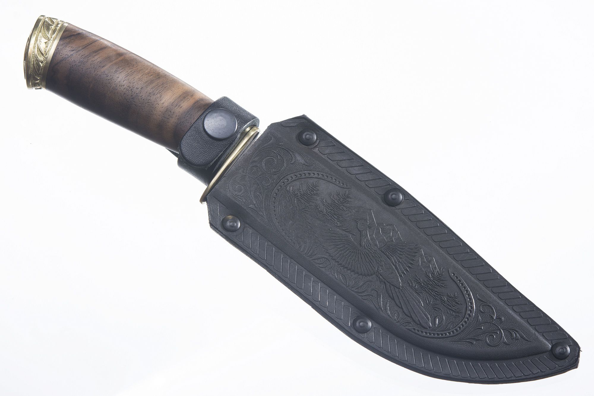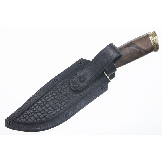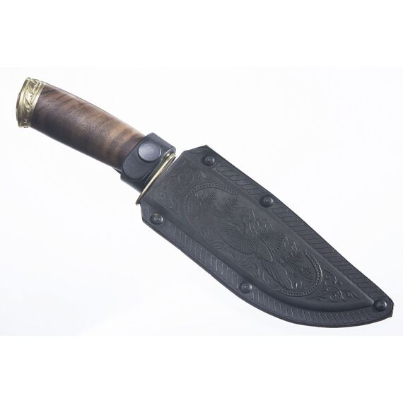 Рисунок на клинке ножа выполнен вручную, при помощи метода двойного травления, что позволяет придать рисунку большую глубину и фактурность. Гарда и навершие ножа выполнены из латуни с тиснением рисунка на металле, благодаря этим элементам нож имеет более привлекательный внешний вид и прекрасно подойдет в качестве подарка.