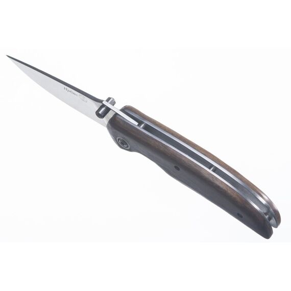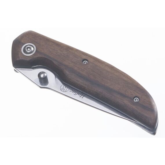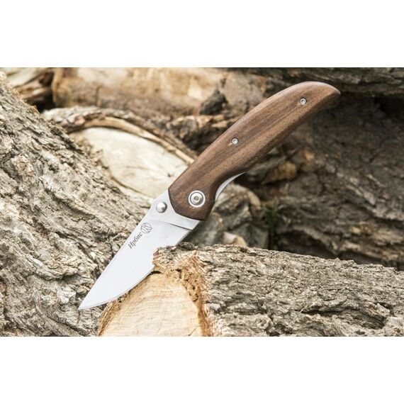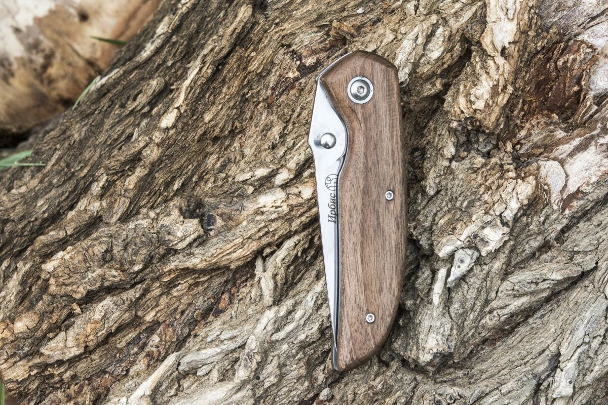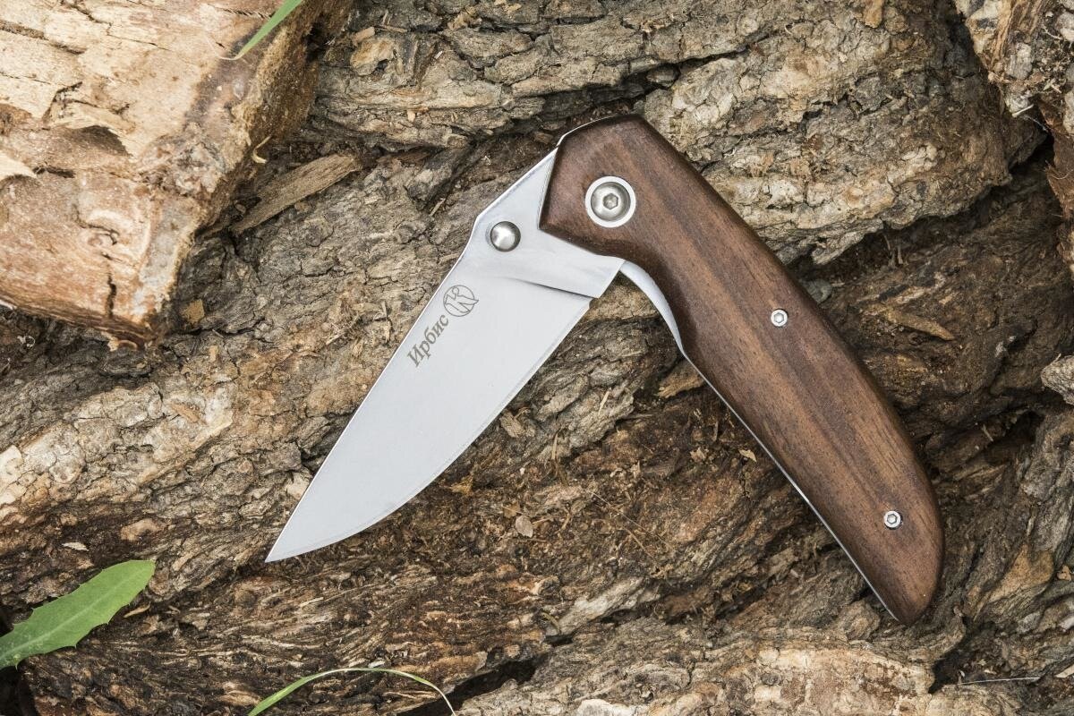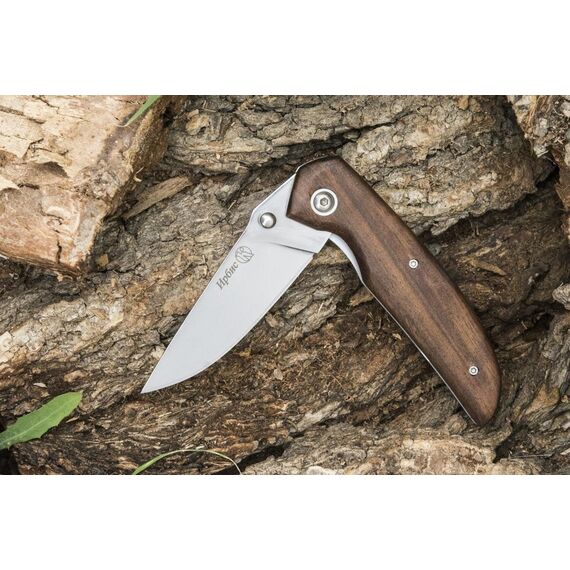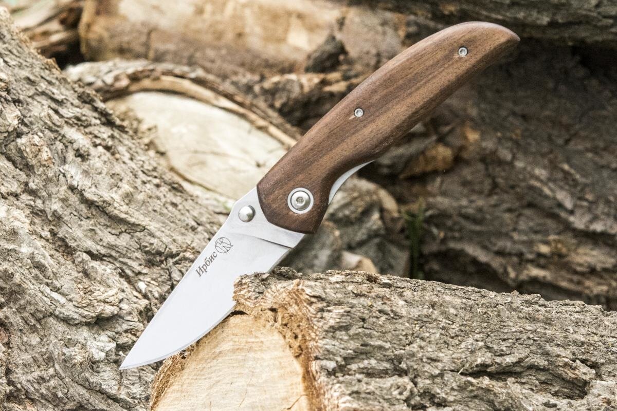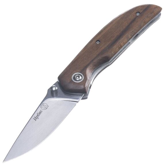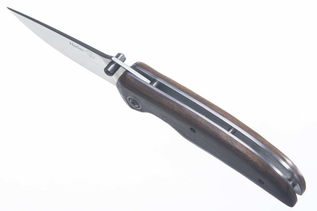 Агрессивность и хищность формы ножа и в то же время благородство и плавность линий – отличительные черты ножа Ирбис, именно за эти качества он и получил свое название. Конструкция ножа – линейный замок. Форма клинка, сужающаяся к острию, на обухе клинка специальный выступ для упора большим пальцем при силовых резах. Скругление рукояти со стороны навершия делает комфортной работу ножом хватом с упором рукояти в ладонь, например, при необходимости что-нибудь вырезать острием. Для крепления плашек используются винты из нержавеющей стали. Деревянные плашки рукояти пропитаны специальным компаундом для повышения влагостойкости рукояти.