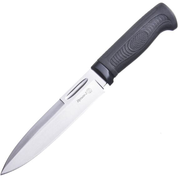 Туристический нож «Иртыш-2» компании Кизляр разработан, как элемент системы выживания в сложных климатических условиях. Кинжальная фора клинка сочетается с ромбическим сечением. На каждой стороне расположено ребро жесткости. Конструкция усилена с помощью пяты и хвостовика, который проходит рукоять насквозь. Таким ножом можно колоть лед или пробить капот автомобиля. Объемная рукоять из обрезиненного пластика не скользит даже в мокрой руке. Ножны со свободным подвесом предназначены для активного движения по пересеченной местности.