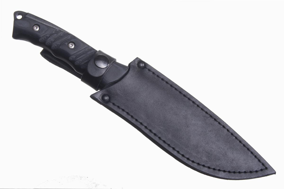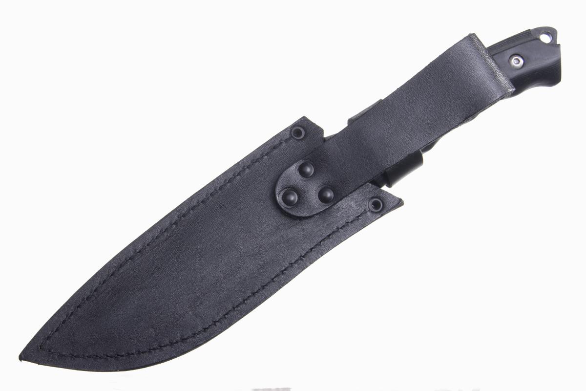 В комплектацию ножа входят прошитые и проклепанные кожаные ножны черного цвета, с подвесом на ремень и фиксирующей клипсой.