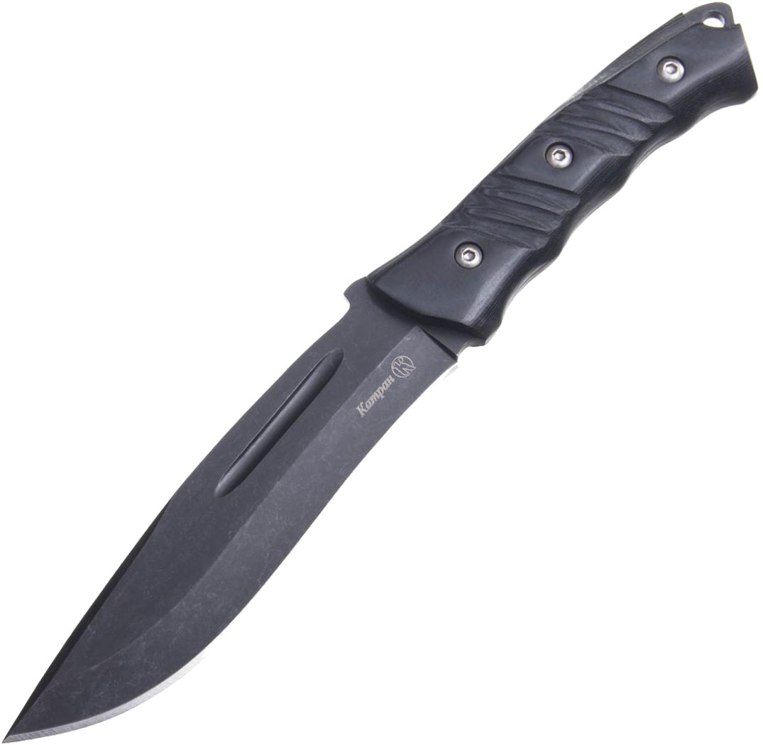 Катран – большой туристический нож (общая длина 300 мм), с клинком 165 мм, изготовленным из японской стали AUS-8, с твердостью металла по Роквеллу 55-57 HRC. Клинок широкий, классический, слегка снижается к острию и напоминает профиль игольчатой акулы - отсюда нож и получил своё название. Заточка вогнутая, полуторная, очень острая уже с завода. Линии спуска начинаются от середины клинка, а на голоменях сделаны долы для усиления конструкции. Толщина в зоне обуха составляет 4,8 мм. Клинок «Катрана» обработан темным защитным антибликовым покрытием.