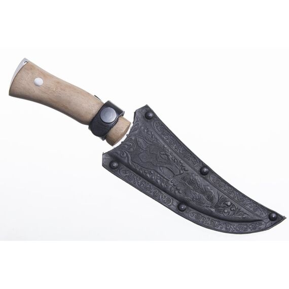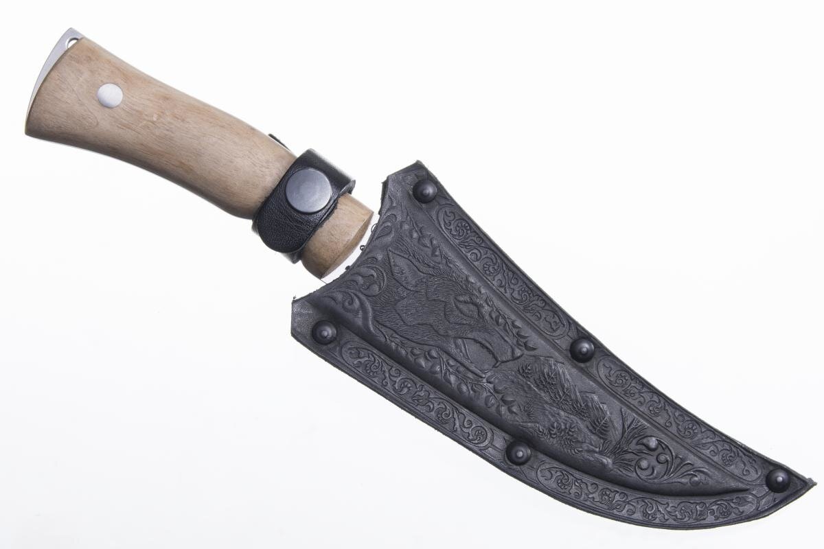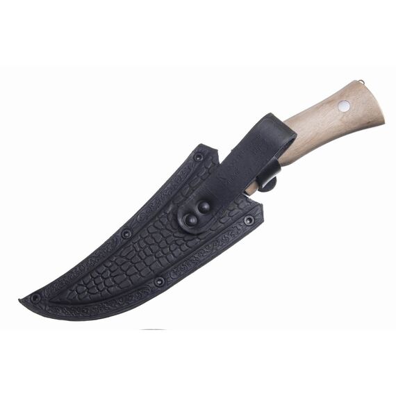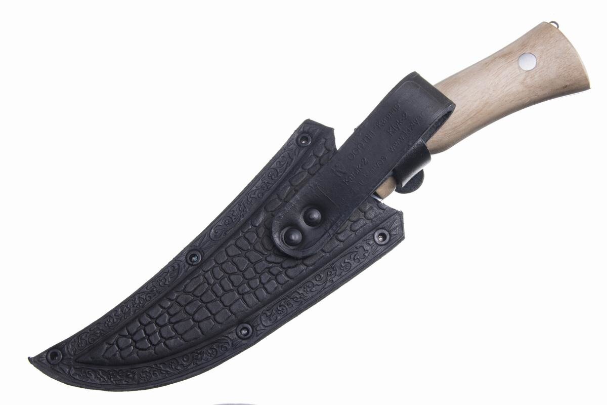 Стремительный дизайн с очень острым кончиком и хищный животный оскал придают ножу Клык-2 очень агрессивный и дерзкий вид. Очень удобная рукоять из натурального ореха с подпальцевыми выемками обеспечивает надежный приятный хват и снижает риск соскальзывания руки на клинок. На спинке клинка отведено место для упора под большой палец, позволяющее безопасно применять большую силу при работе с ножом.