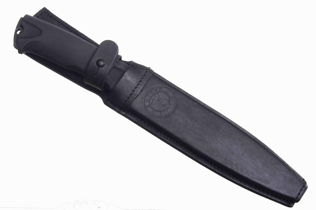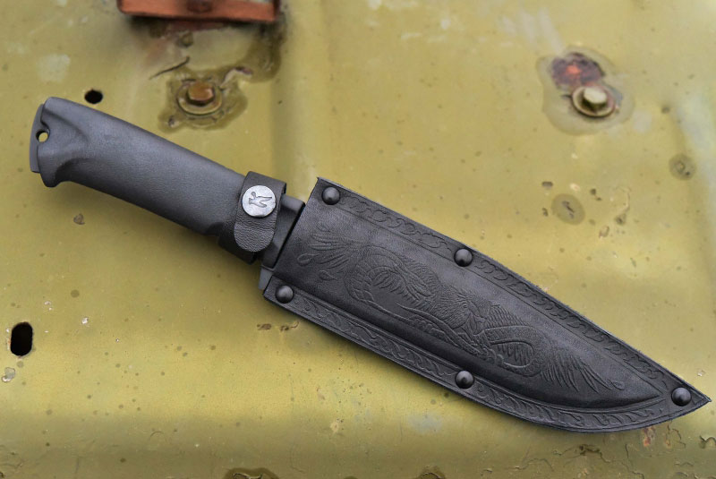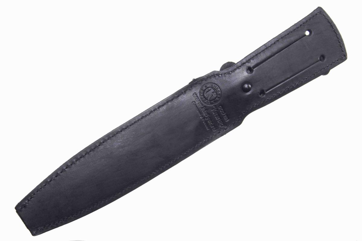 Рукоять в нижней части имеет ограничители для предотвращения соскальзывания ладони при совершении силовой работы. Нож выполнен по технологии сквозного монтажа: хвостовик проходит рукоять насквозь и выступает с обратной стороны, образую ударную платформу с темлячным отверстием.Нож укомплектован ножнами из пластика обтянутые качественной кожей.