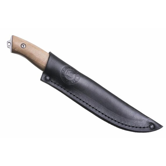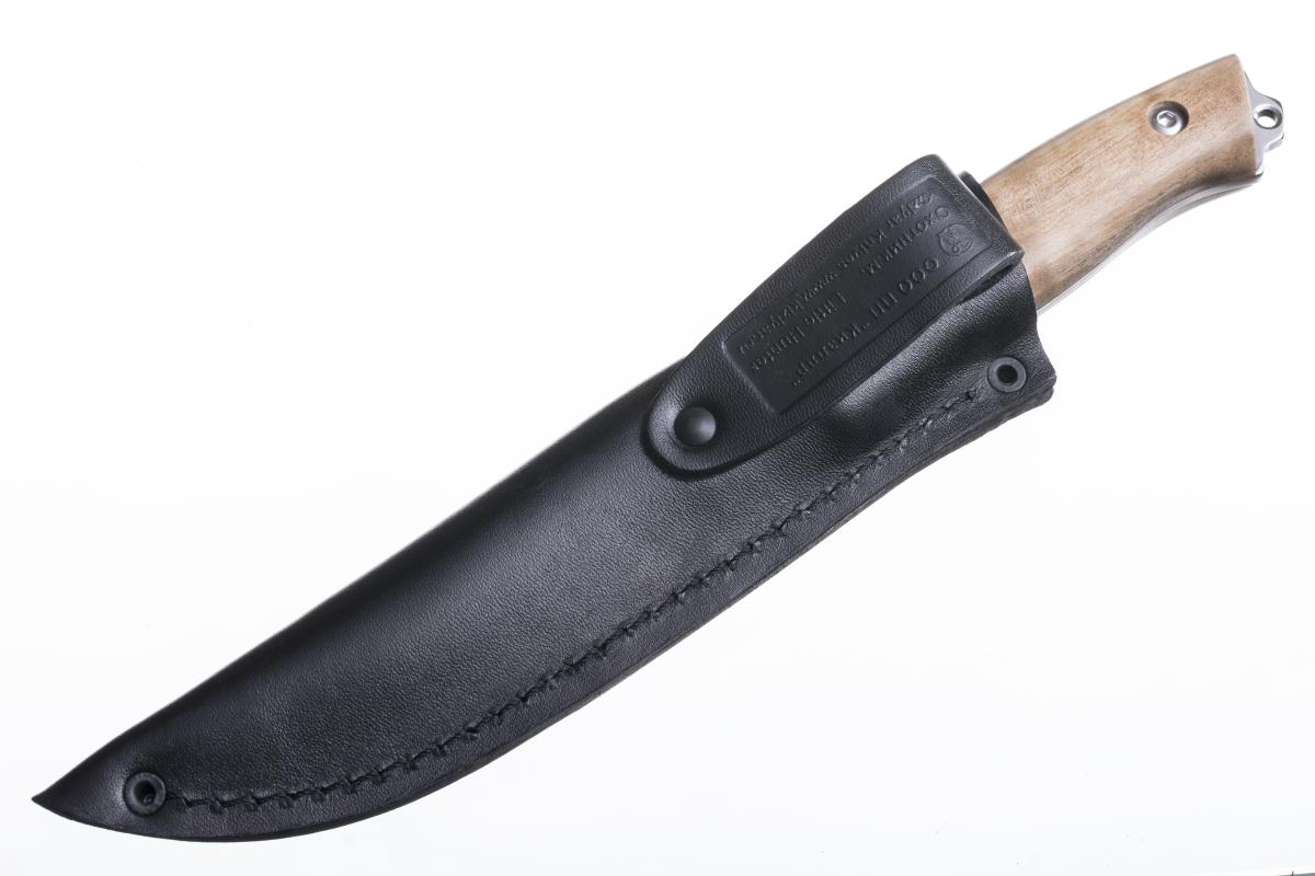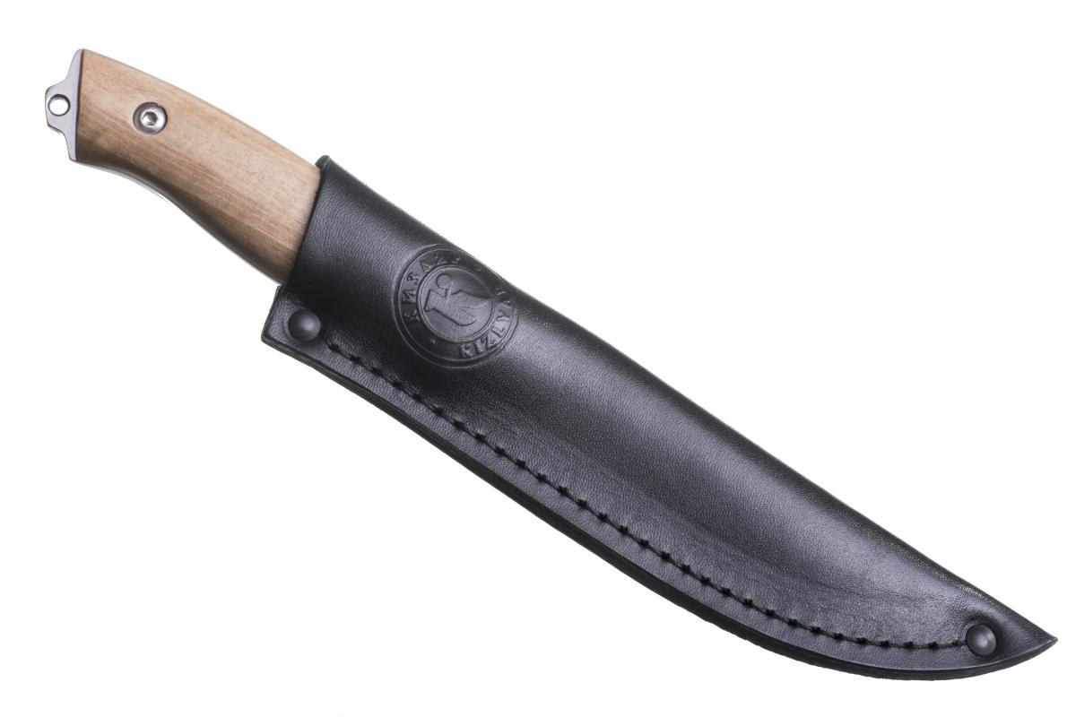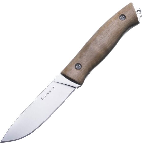 «Был у попа работник. Столяр, повар плотник…». Нож с фиксированным клинком «ОХОТНИК МАЛЫЙ» компании КИЗЛЯР относится к категории универсальных полевых ножей. Нож оснащен эргономичной рукоятью, которая уверенно удерживается голой рукой и рукой в перчатке. Клинок ножа рассчитан на строгание древесины, разрезание веревок, работу по продуктам. Нож изготовлен по технологии «фулл-танг», что обеспечивает высокий запас прочности. Хвостовик клинка проходит сквозь рукоять и образует ударное навершие с отверстием под темляк. Ножны погружного типа предназначены для переноски на поясном ремне.