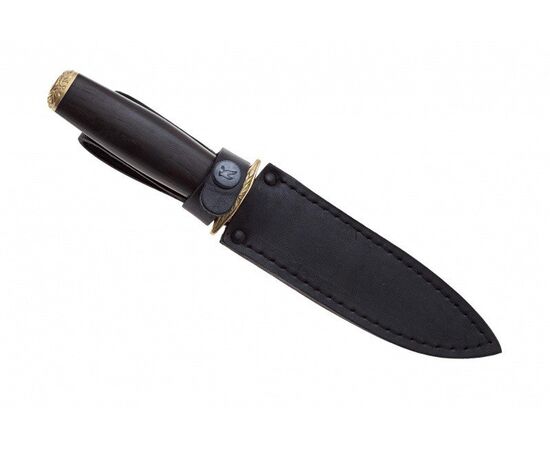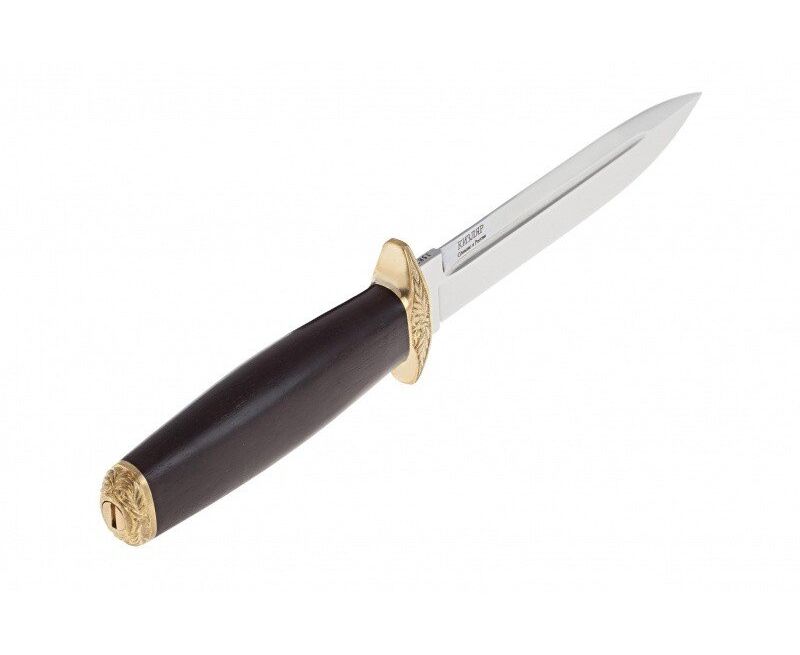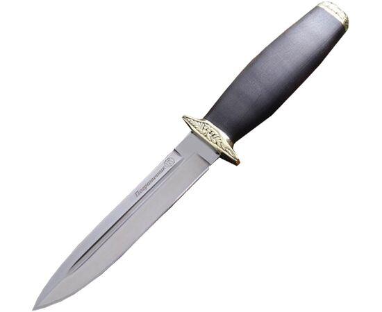 Пограничник это надежный нож кинжального типа, выполненный по мотивам советских ножей военного времени. Клинок ножа выполнен из стали устойчивой к коррозии и закален до 55-57 HRC. Клинок оснащен фрезерованными долами для снижения веса и увеличения прочности. Рукоять выполнена из дерева, а так же оснащена гардой и задником из латуни. Латунные элементы декорированы рифлением.