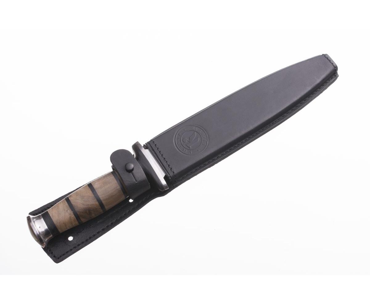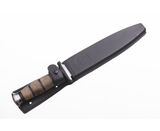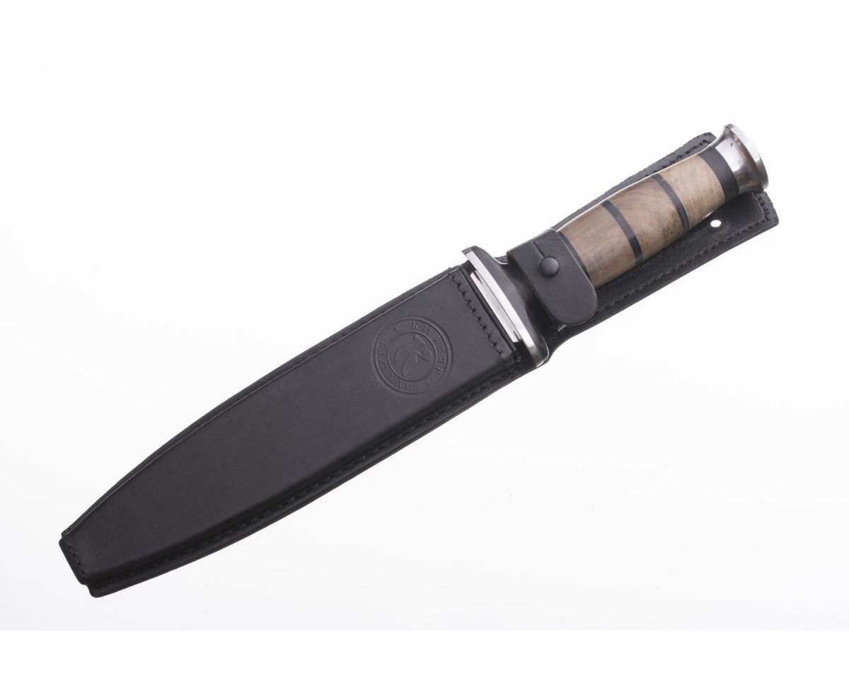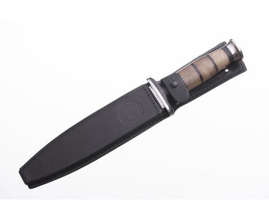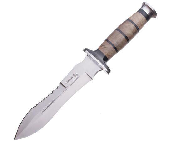 Охотничий нож «Сталкер" относится к гражданскому холодному оружию и может быть использован в качестве боевого ножа благодаря своей конструкции и техническим характеристикам. Клинок «Сталкера» имеет копьеобразную форму, но выполнен с некоторым увеличением ширины в зоне острия. Помимо основного режущего лезвия, на передней части обуха также сделана заточка серрейторная на 2/3. Корневая часть клинка имеет незаточенные участки для реализации хватов ножа с выносом пальцев на клинок. Сталь, использующаяся для изготовления этого охотничьего кинжала, коррозионностойкая, AUS-8, твердостью 55-57 HRC. Небольшая стальная крестовина кинжала предохраняет кисть руки от соскальзывания при колющем ударе на лезвие. Рукоять кинжала изготовлена на стальном хвостовике по всей длине рукояти, методом всадного монтажа, и имеет стальное навершие для использования оружия в качестве молотка или для травматического удара. Ножны, идущие в комплекте к кинжалу, изготовлены из пластика, обтянутого кожей (поясные ножны).