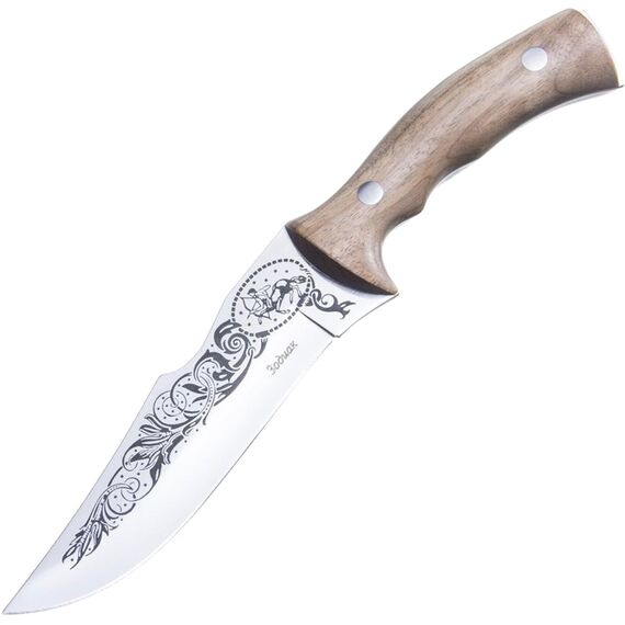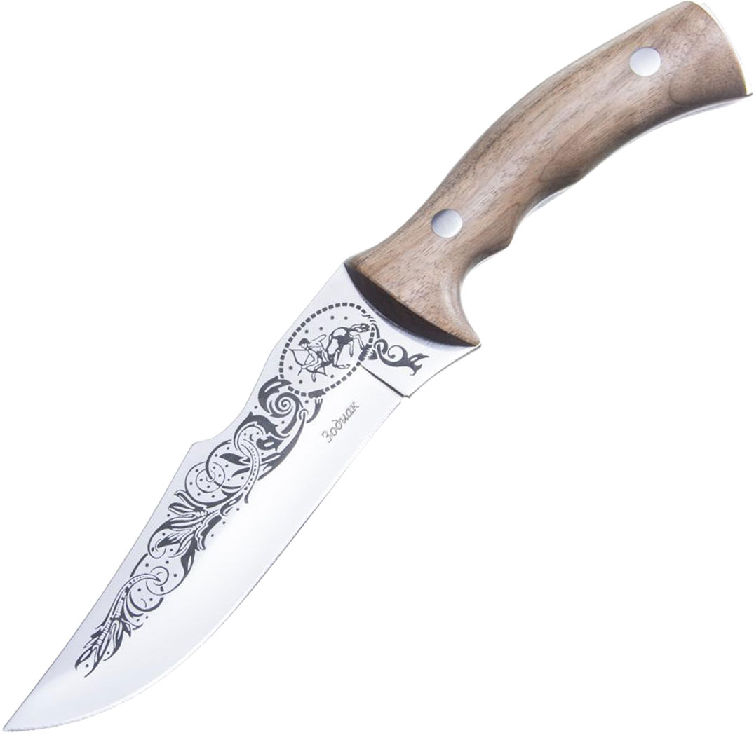 Туристический нож «Зодиак», это ответ на вопрос – что подарить человеку, который увлечен астрологией. На клинке ножа размещена гравюра, которая изображает символы на звездном небосклоне по восточному гороскопу. Геометрия ножа предназначена для работы по продуктам, строгания древесины и разрезания веревок. Изогнутая рукоять выполнена из натуральной древесины, которая в процессе работы отдает приятное тепло. Кожаные ножны украшены символам знаком зодиака.