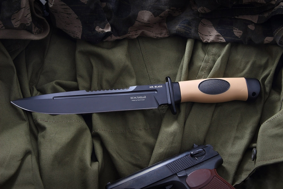 Тактический нож «Вежливый» компании Mr.Blade (Мистер Блейд) разработан для «вежливых людей». Это универсальный инструмент, который найдет применение при проведении спецопераций, спасательных работ и на промысловой охоте в дикой природе. В этом ноже нет мелочей. Каждый элемент, каждая деталь имеет свое назначение. Клинок кинжального типа рассчитан на нанесение сильных проникающих ударов. Волнообразная насечка на обухе используется для усиления поражающих свойств ножа. Гарда-крестовина защищает пальцы от соскальзывания на режущую кромку в процессе работы. Нож комплектуется ножнами тактического типа с системой крепления «молле».