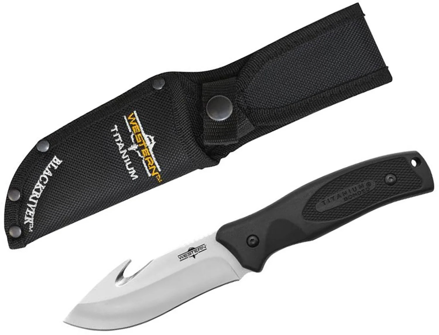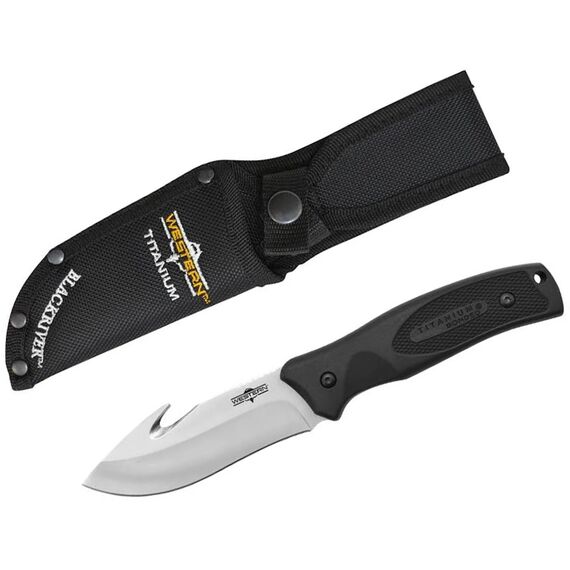 Нож Camillus Western BlackRiver с фиксированным клинком длиной 9,25 дюйма (23,7 см) с титановым покрытием Gut Hook оснащен клинком из стали 420 с титановым покрытием, что обеспечивает идеальный баланс лучших характеристик ножевой стали. Эргономичная рукоять BlackRiver из материала G10 представляет собой чрезвычайно прочную конструкцию из слоев стекловолокна, пропитанных смолой, подвергнутых сильному прессованию и обжигу. Она невосприимчива к влаге и жидкостям и устойчива к климатическим изменениям. Цельный хвостовик обеспечивает прочность режущего лезвия, а также делает рукоять более прочной и жёсткой. В комплект входят ножны из баллистического нейлона, защищающие от попадания мусора и других посторонних предметов.