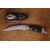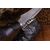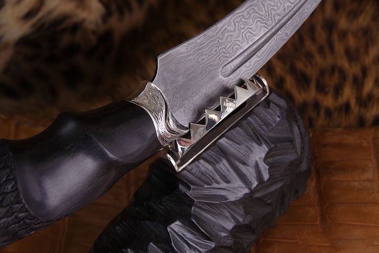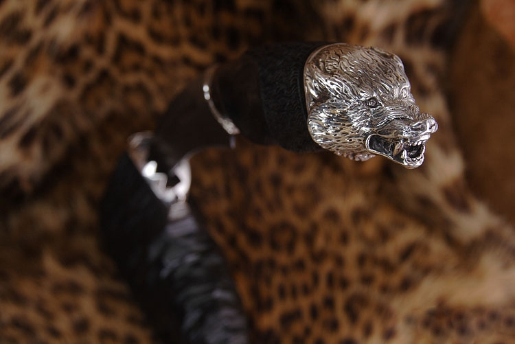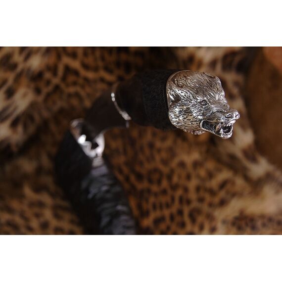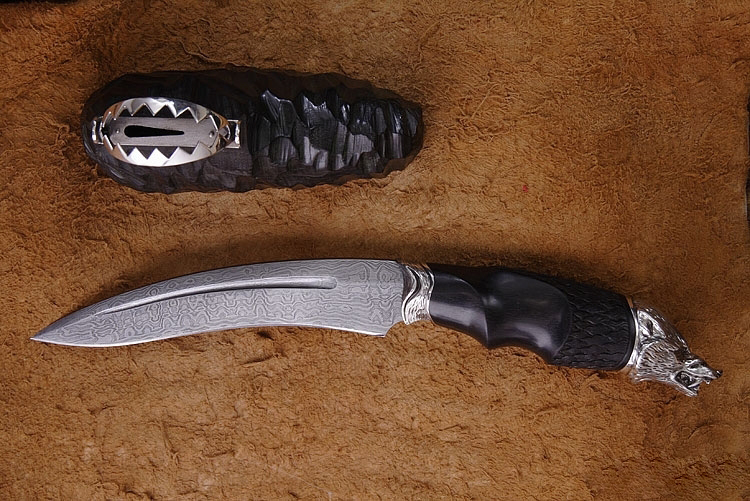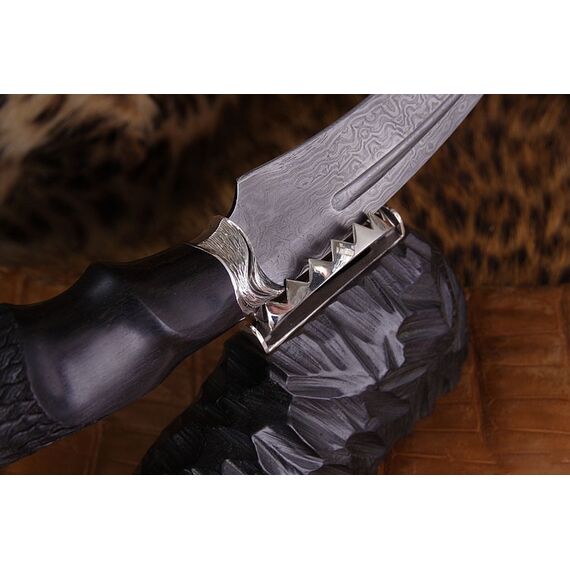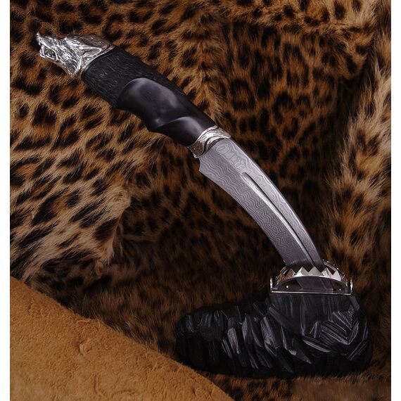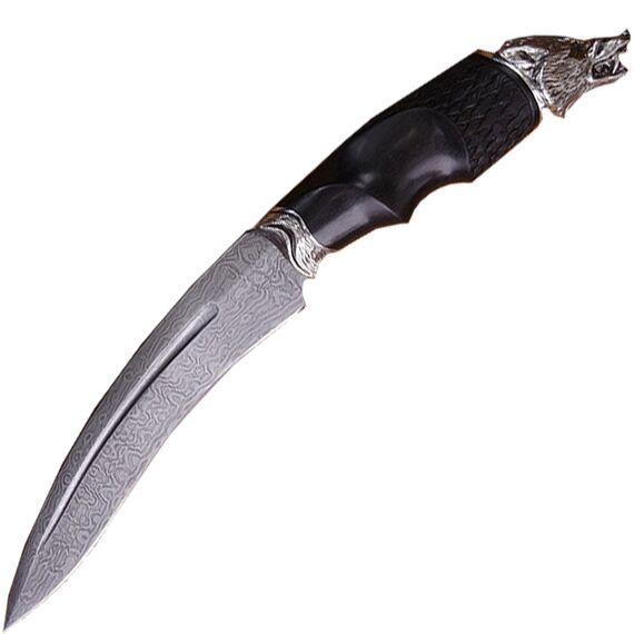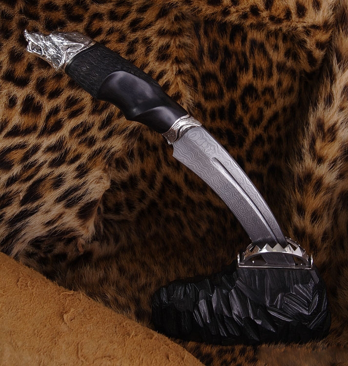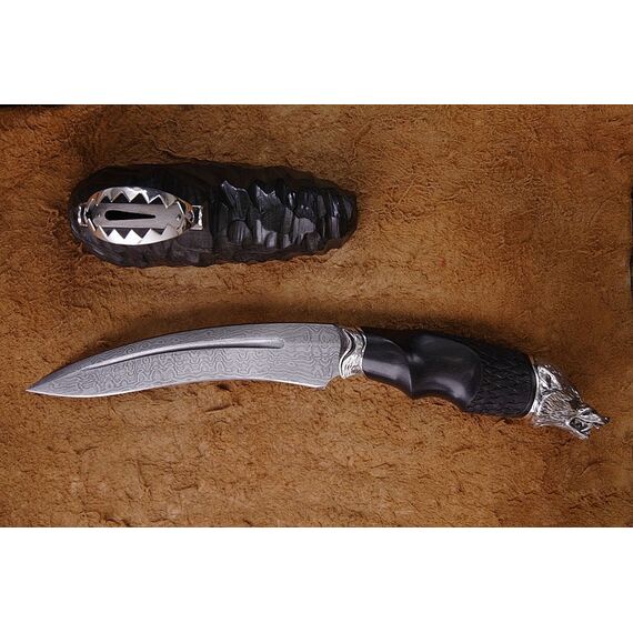 Кабинетный подарочный нож. По форме напоминает волка в прыжке, пытающегося вырваться из капкана. Оскал животного хорошо передает звериную злость и бессилие, динамику отчаянного рывка из западни. Клинок из дамаска по своим контурам похож на волчий клык. Ручная резьба на рукояти имитирует шкуру животного. Интересный художественный нож. Выпускается малой серией. Может стать украшением любой домашней коллекции.