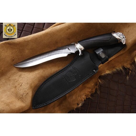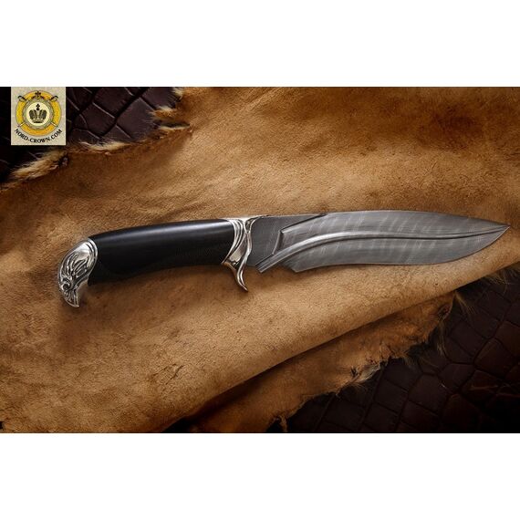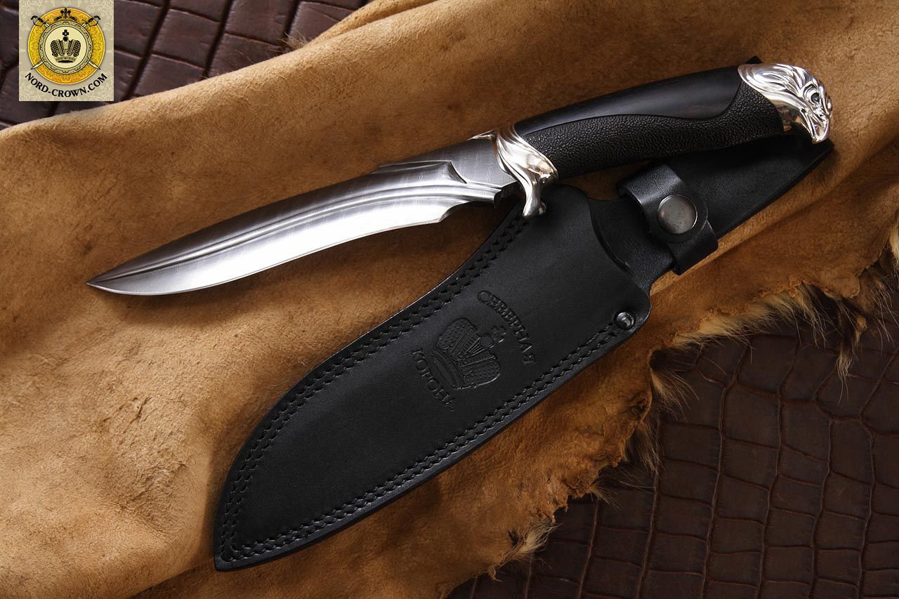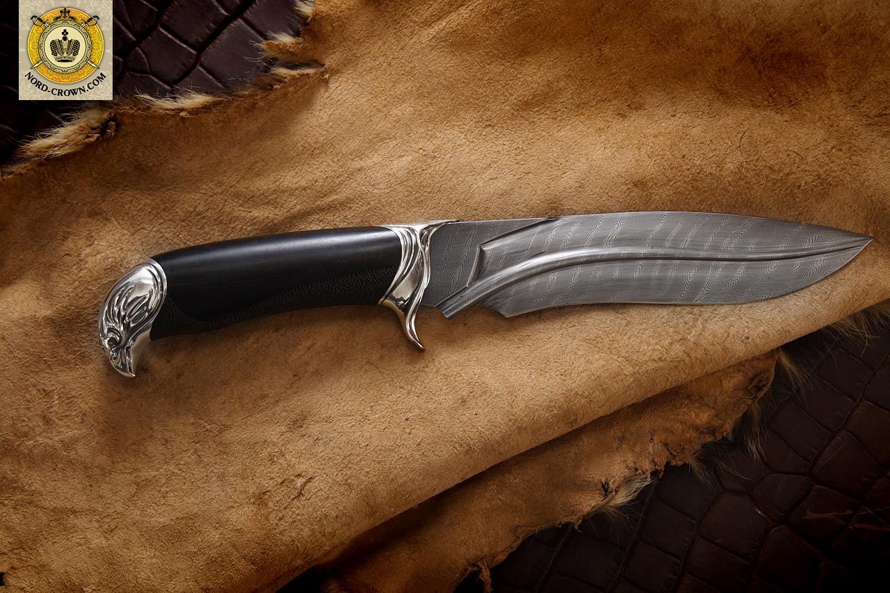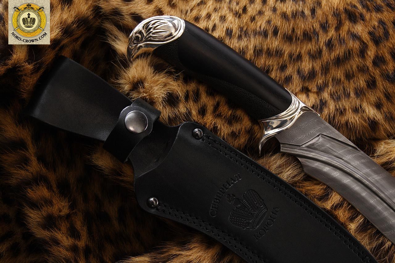 Подарочный нож. Также идеально подходит для охоты и рыбалки. Клинок из дамаска, а рукоять из черного дерева. Серебрянные гарда и навершие в виде головы сокола, придают всему ножу строгий аристократичный вид. Нож выпускается малой серией, предназначен для коллекций. Комплектуется авторским паспортом, ножнами из кожи и подарочной упаковкой.