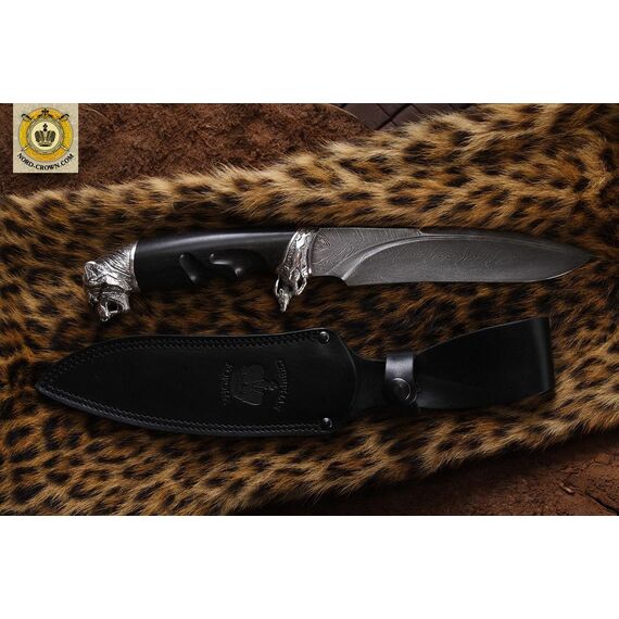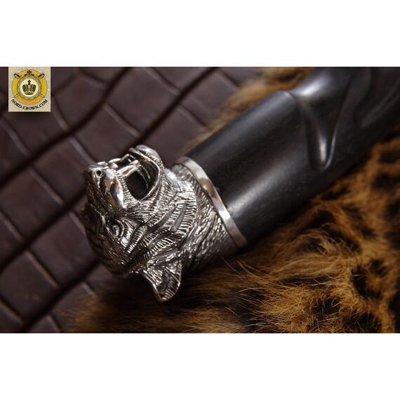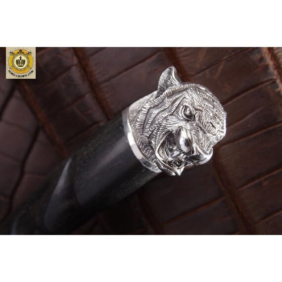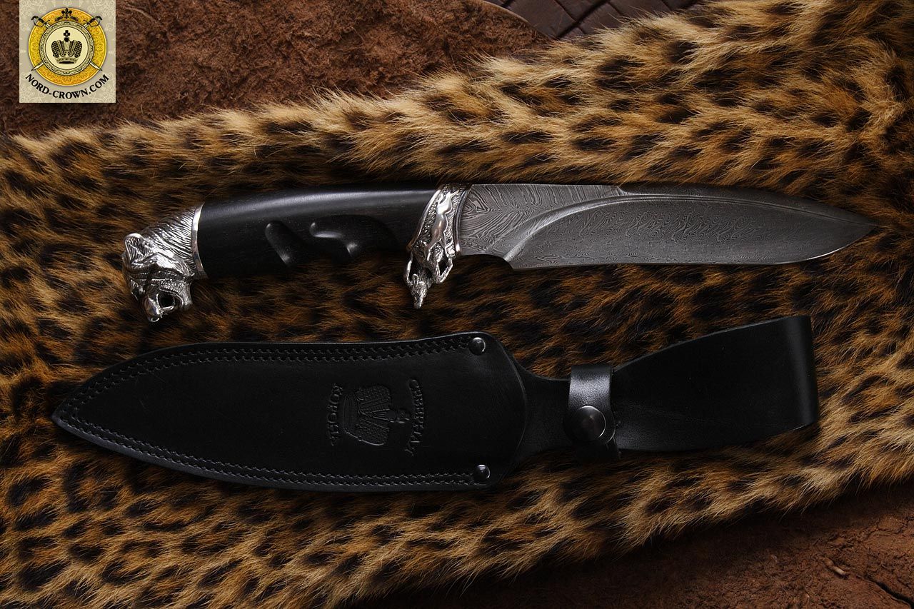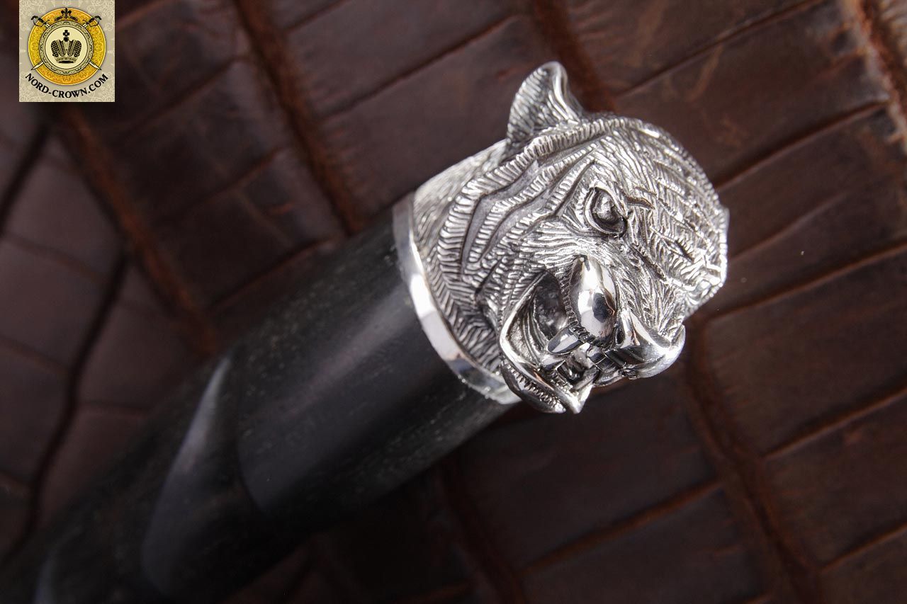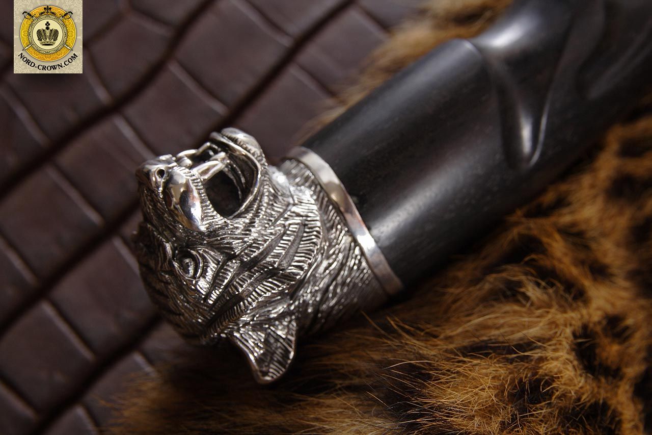 Подарочный нож. Также идеально подходит для охоты и рыбалки. Клинок из дамаска, а рукоять из черного дерева. Серебрянные гарда и навершие в виде головы тигра, придают всему ножу строгий аристократичный вид. Нож выпускается малой серией, предназначен для коллекций. Комплектуется авторским паспортом, ножнами из кожи и подарочной упаковкой.