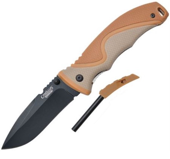 Модель - CM19473. Camillus 19473 — Нож Inflame Linerlock. 4,25 дюйма, закрытое. 3,25 дюйма, черное лезвие из нержавеющей стали 440 с карбонитридным титановым покрытием. Рукоятка из прорезиненного синтетического материала коричнево-серого цвета. Шпилька для большого пальца. Отверстие для шнурка. Карманный зажим. Встроенный зажигалка и свисток в ручке.
