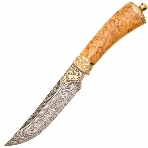 Авторский нож. Прекрасно подходит как для туристических, так и для охотничьих целей. Клинок выкован из дамасской стали. На обухе клинка методом травления и позолоты изображена куница в орнаментном узоре. Отсюда название ножа. Гарда и навершие украшены фианитами. Рукоять изготавливается из карельской березы и покрыта шеллаком. Нож выпускается в двух вариантах: как туристический и как охотничий (т. е. номерной) Комплектуется кожаными ножнами.
