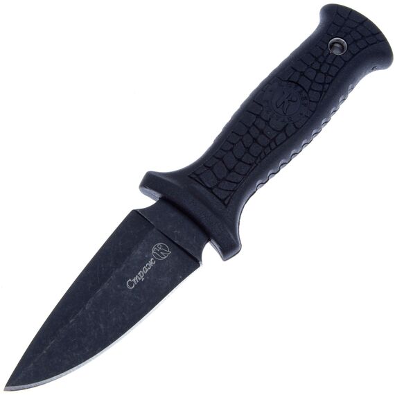 Рукоять «Стража» очень удобная для любой руки, изготовлена из резинопластика Elastron G, с отверстием для темляка, усиленным развальцованной стальной втулкой из нержавеющей стали, которая дополнительно крепит хвостовик внутри рукояти.