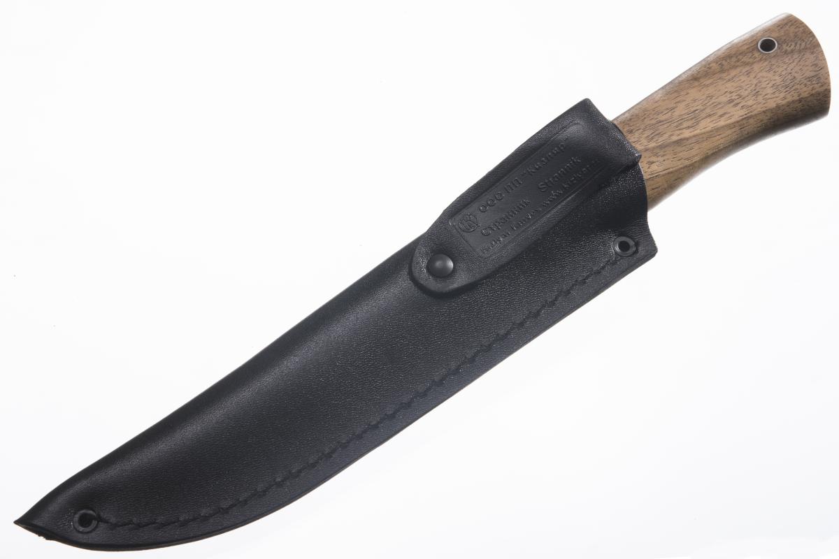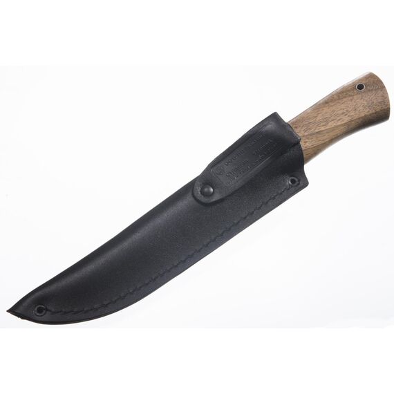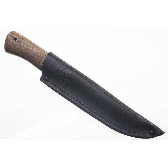 Нож Странник – полноценный рабочий нож длиной 245 мм, со 125 мм клинком из стали AUS-8 или Z90, с вогнутой полуторной заточкой и деревянной рукоятью из кавказского ореха.