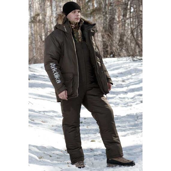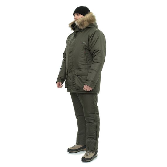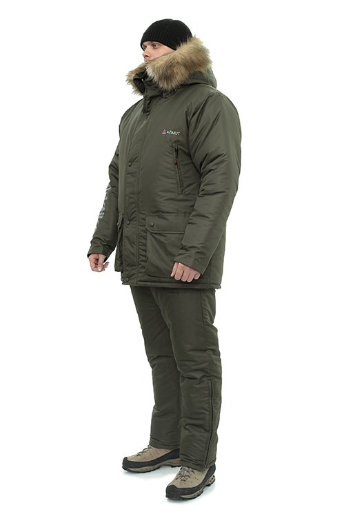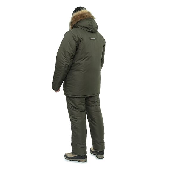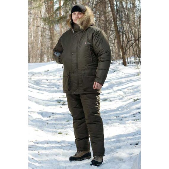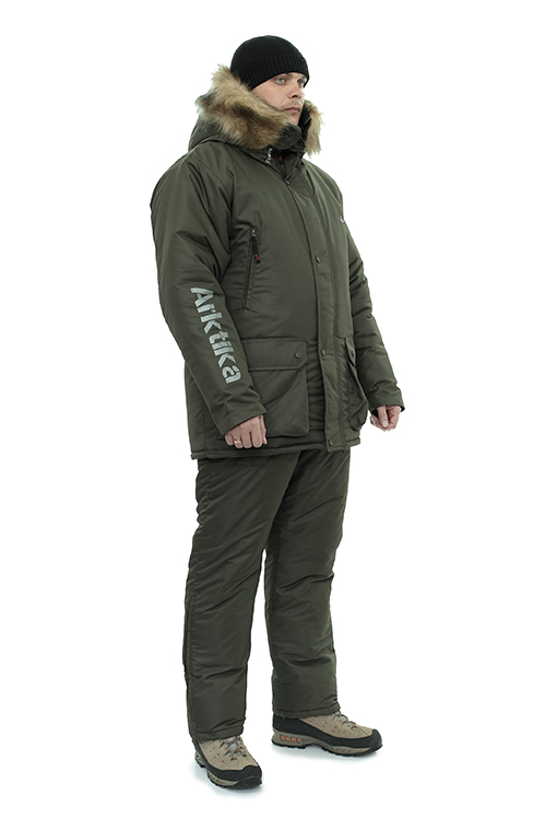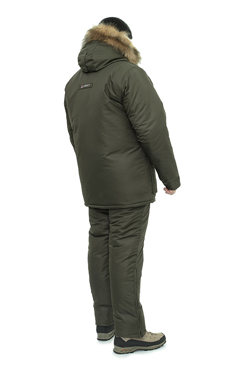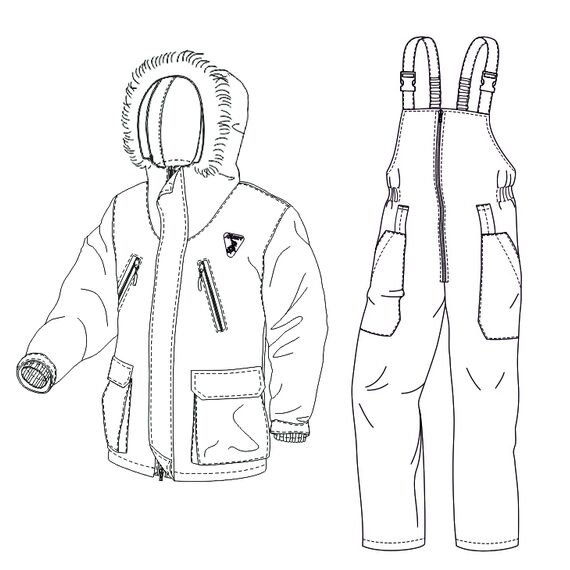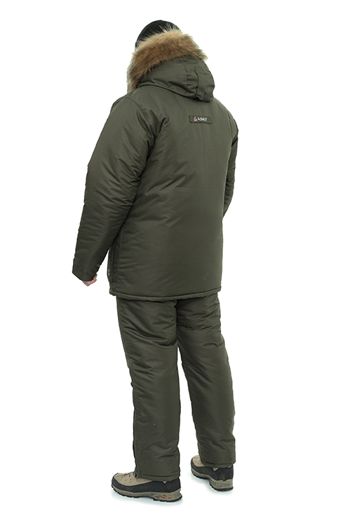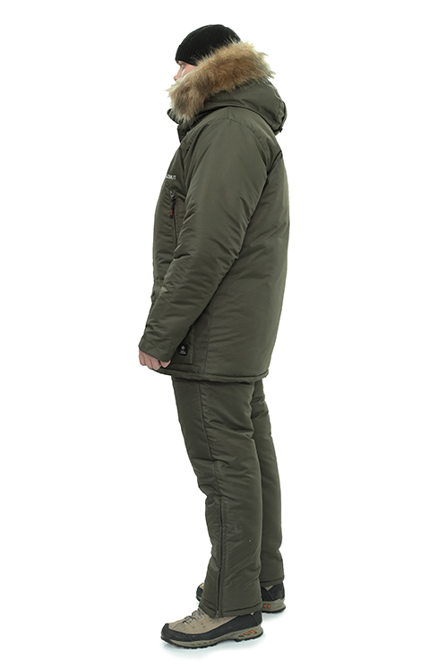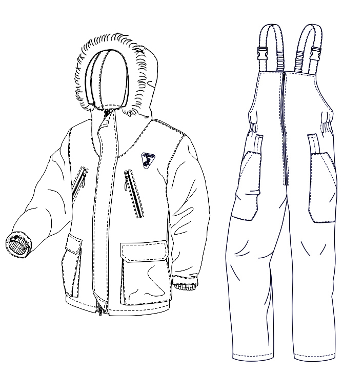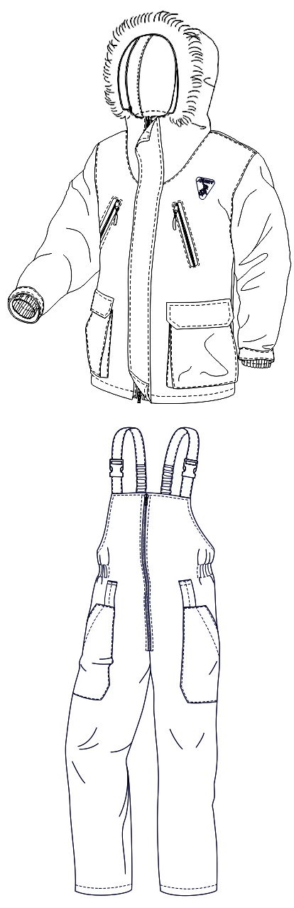 Прямая модель. Куртка три слоя утеплителя. Высокий воротник. П\К два слоя утеплителя. Подклад лопатки флис. Молния Трактор-8 два бегунка. Куртка шесть карманов +один на молнии внутри. Опушка-иск.мех отстегивается. Капюшон не отстегивается. На рукавах трикотажные манжеты. Внутри куртки юбка от ветра. Полукомбинезон имеет два кармана. Низ брючин растёгивается-для сапогов ЭВА. Температура в активном режиме-35С.