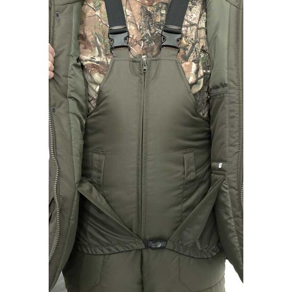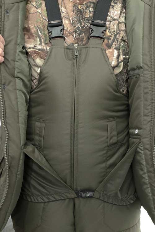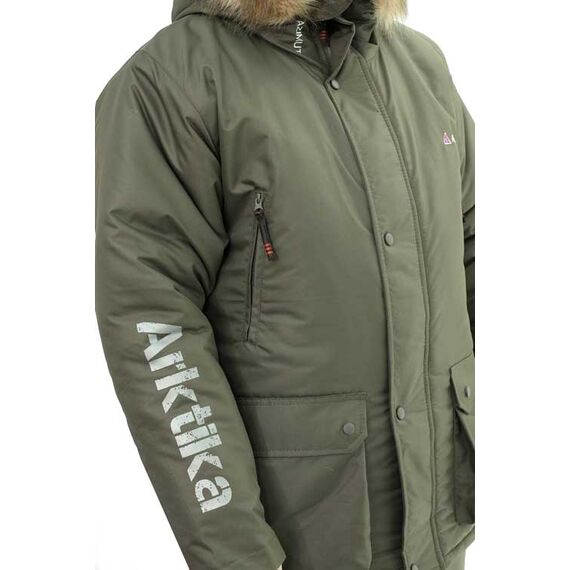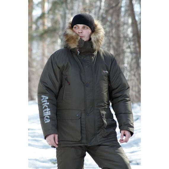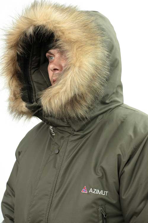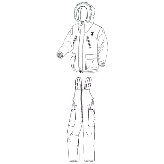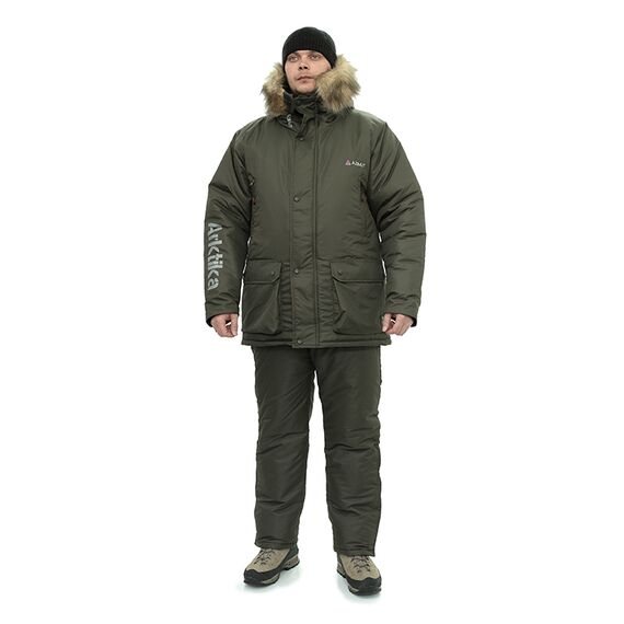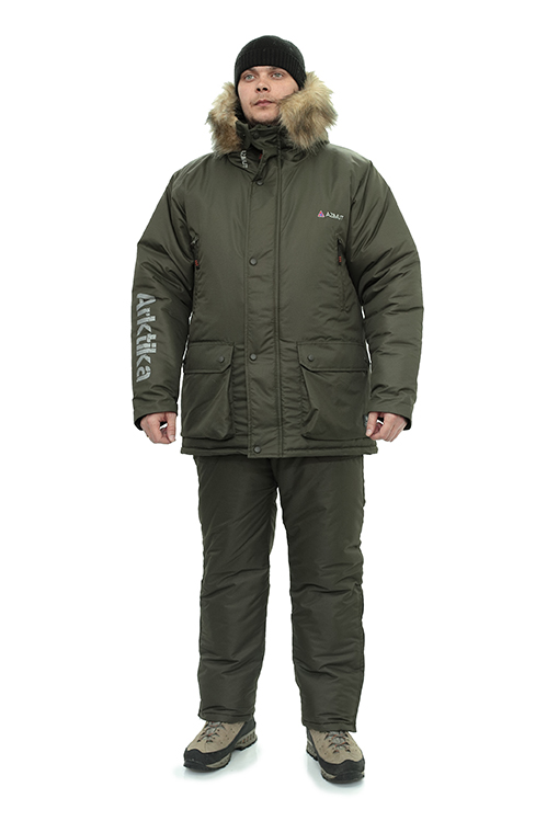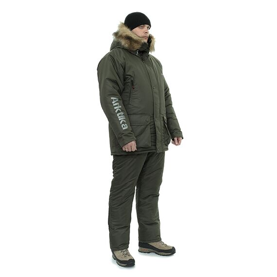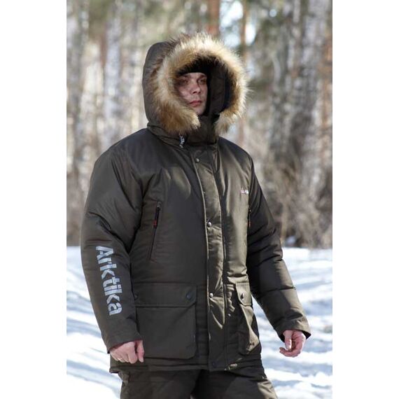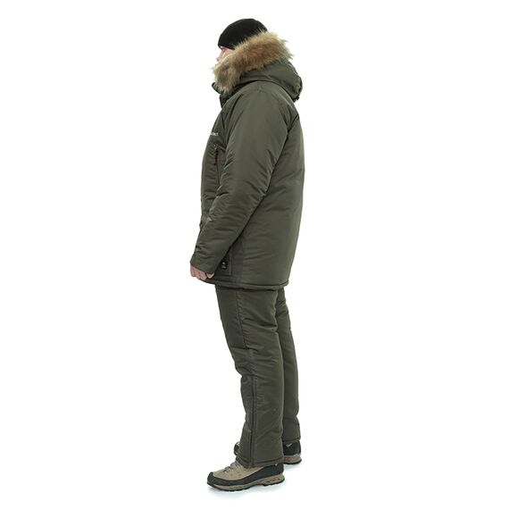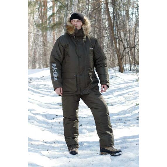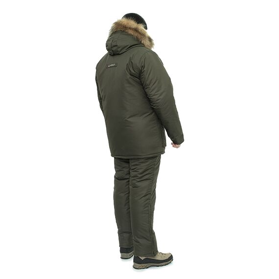 Прямая модель. Куртка три слоя утеплителя. Высокий воротник. П\К два слоя утеплителя. Подклад лопатки флис. Молния Трактор-8 два бегунка. Куртка шесть карманов +один на молнии внутри. Опушка-иск.мех отстегивается. Капюшон не отстегивается. На рукавах трикотажные манжеты. Внутри куртки юбка от ветра. Полукомбинезон имеет два кармана. Низ брючин растёгивается-для сапогов ЭВА. Температура в активном режиме-35С.