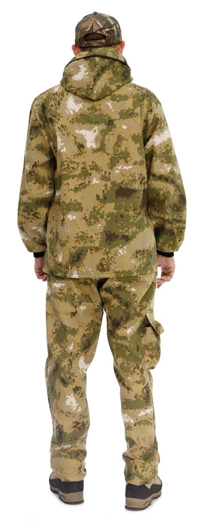 Брюки 2 кармана. Шлевки под ремень, резинка брюк снизу. Ловушки-воланы на куртке и брюках. Под воланами ворсистая белая ткань от клеща. Гетры снизу брюк и в рукавах. А так-же юбка из бязи от клеща.Ткань смесовая 160 гр