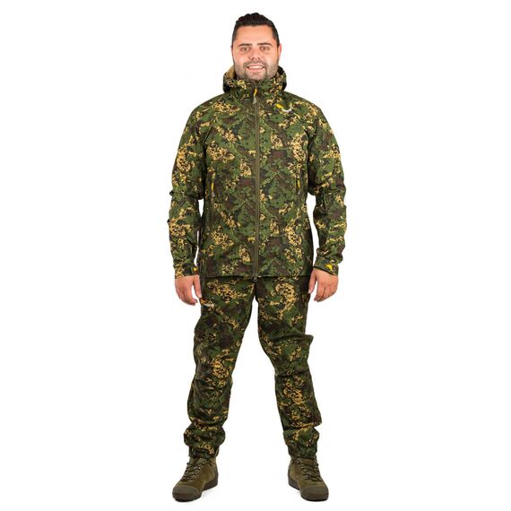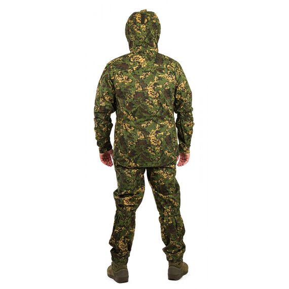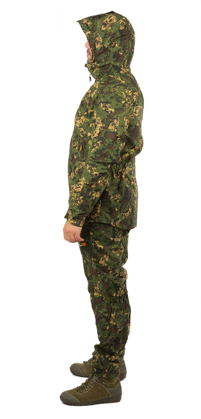 Комплект состоит из куртки и брюк. Куртка анатомического кроя с капюшоном оснащена регулировкой с помощью шнурка с фиксатором и липы. Ширина манжет рукавов также регулируется с помощью липы. Два внешних кармана застегиваются на молнии. В куртке есть внутренний карман для документов с усиленной влагозащитой.