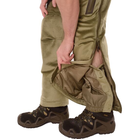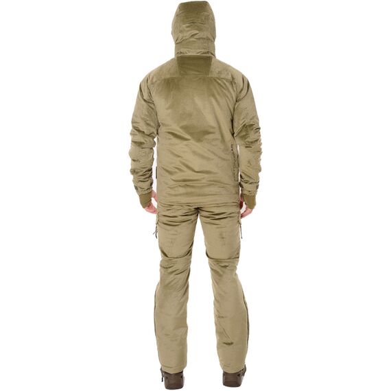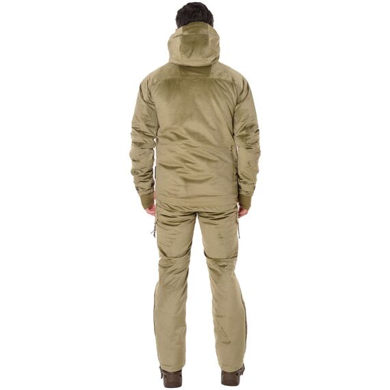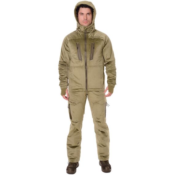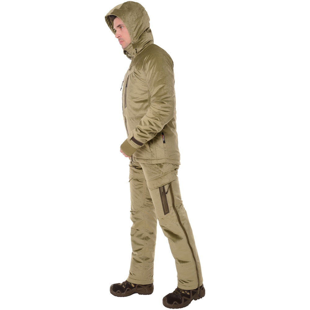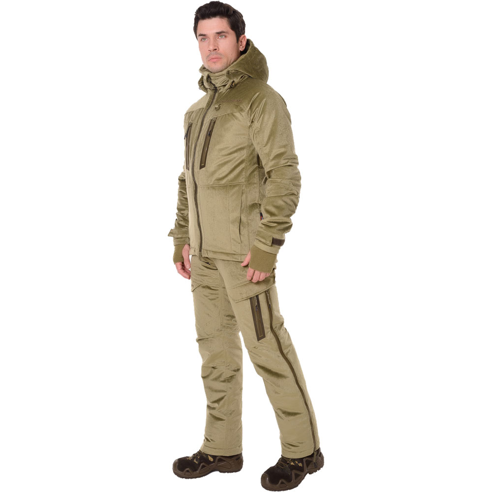 Основной материал Вилтекс (VilTex) - суперсовременная трехслойная мембранная ткань с превосходными показателями паропроницаемости (30000!!!) и ворсистым внешним слоем, благодаря которому она абсолютно не шуршит, мягкая и очень приятная на ощупь. Отлично защищает от ветра и осадков (10000). Высокий воротник-стойка дополнительно защищает от непогоды. Цвет хаки. Костюм подойдет для высокой активности.