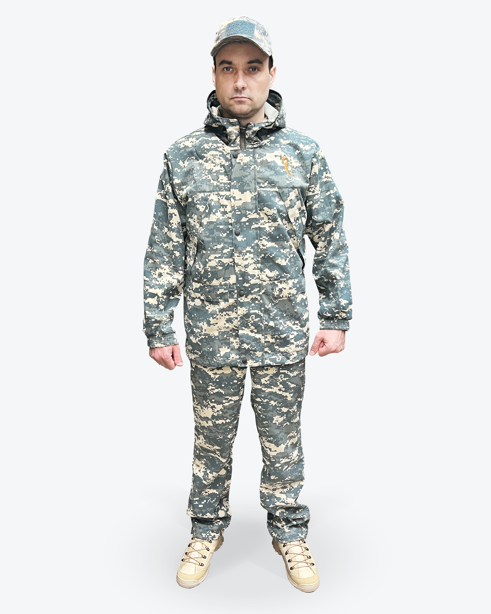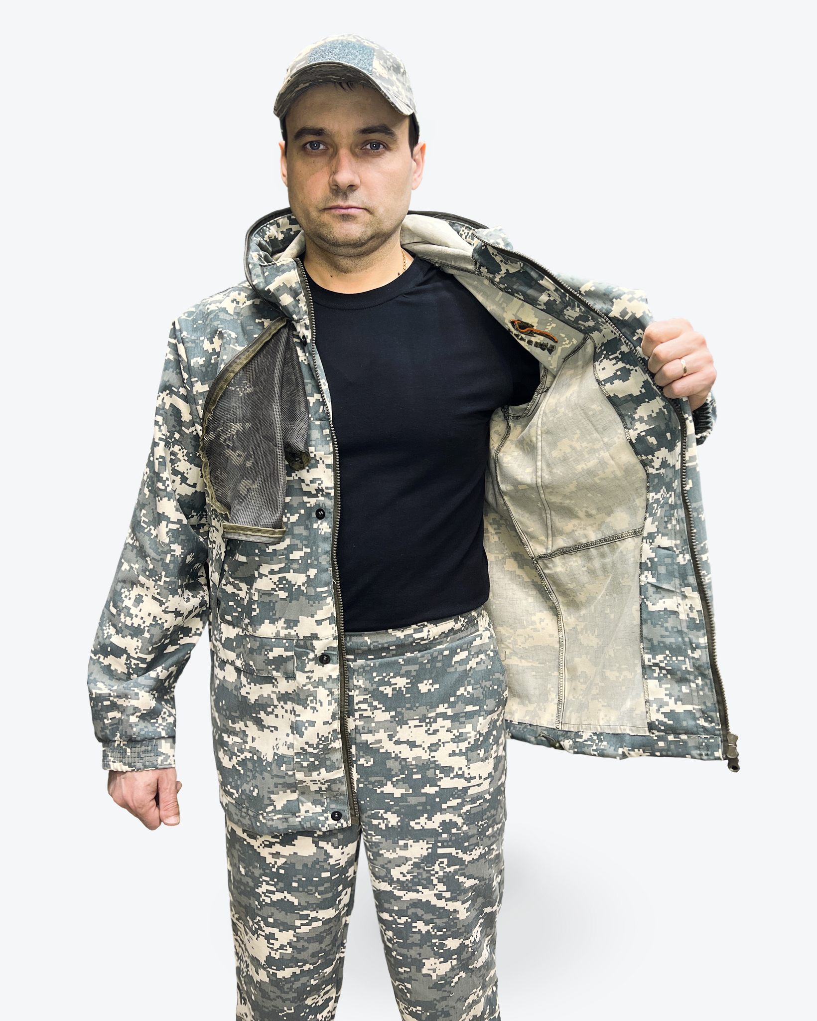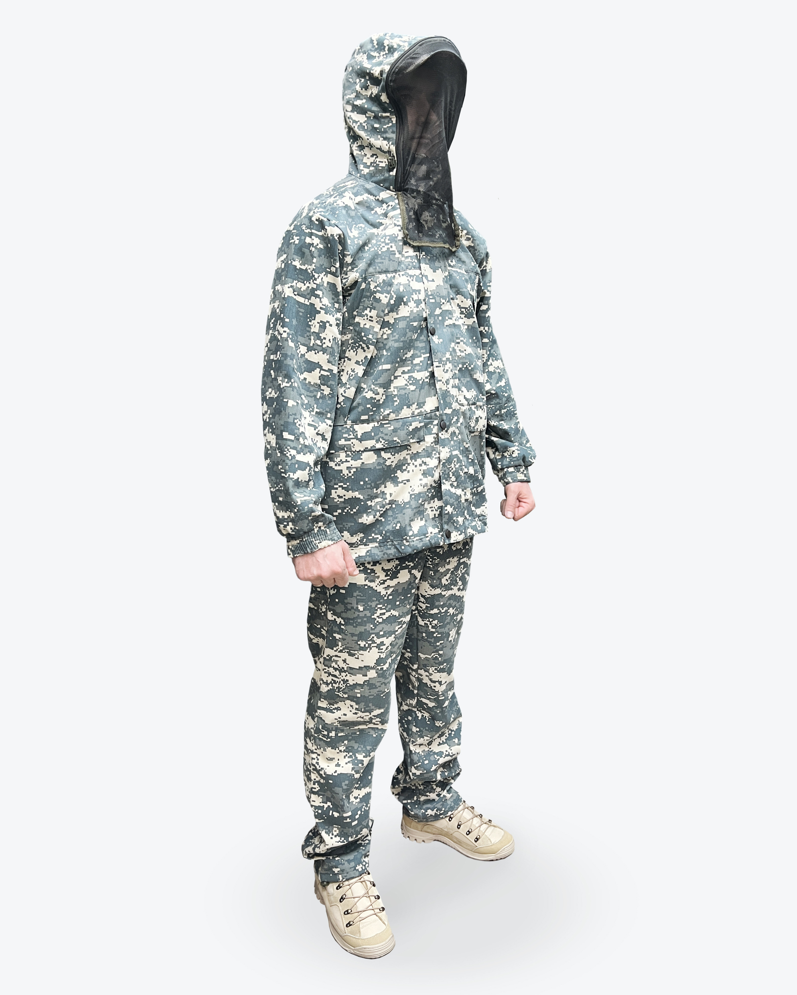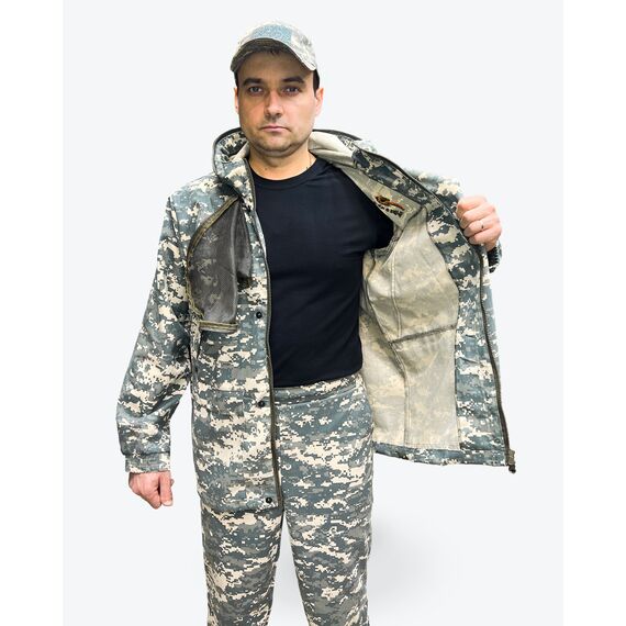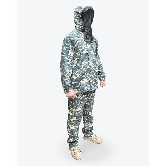 На куртке имеется капюшон вокруг которого пристегивается антимоскитная сетка, которая убирается в нагрудный корман, капюшон утягиваеься по овалу лица. Куртка анорак, прямая удлинённая с утяжками по низу с двумя врезными карманами на молнии, противоклещевые ловушки на шее, на рукавах и на теле. На рукавах имеется внутренний защитный противоклещевой клапан. Противоклещевая защитная юбка внутри куртки.