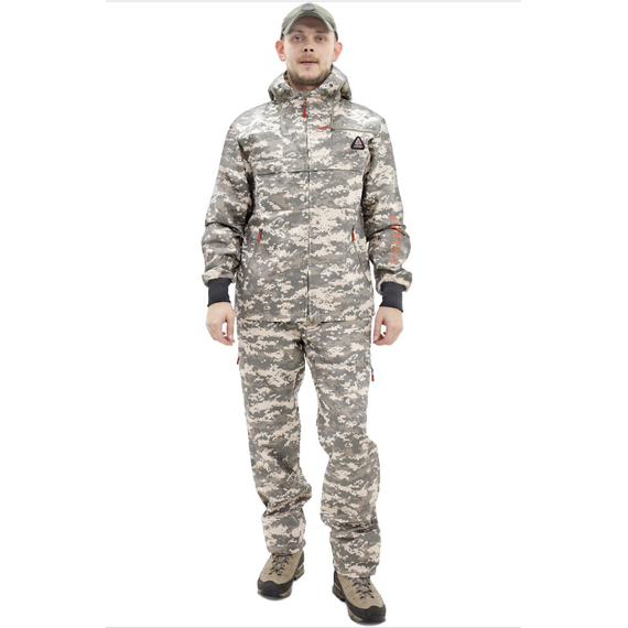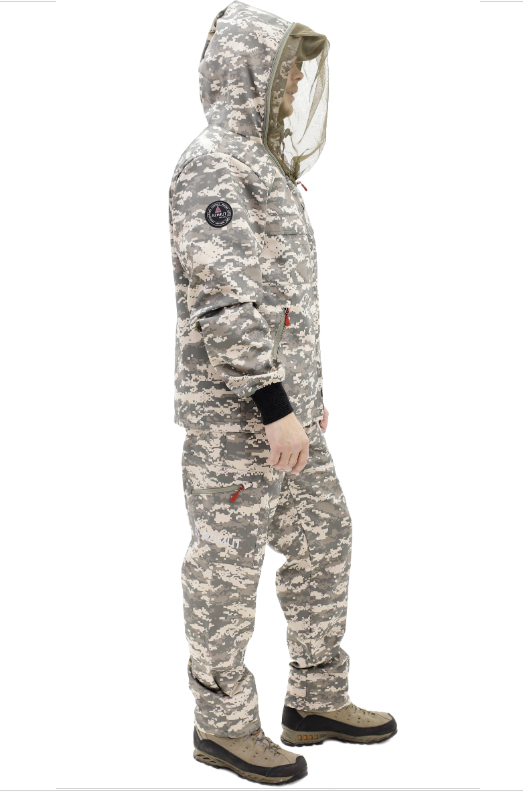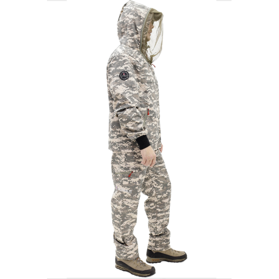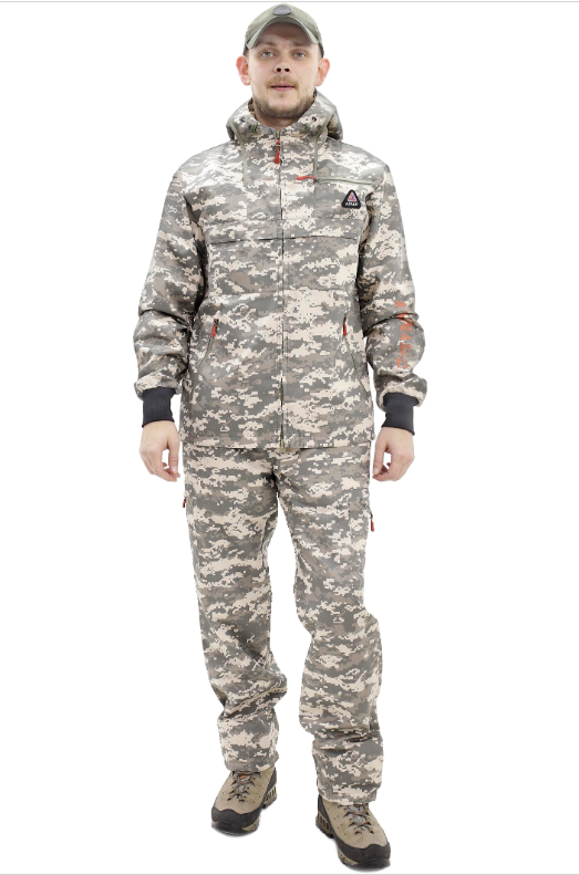Прямая модель, удлиненная куртка. На Куртке пять карманов. Отдельный карман на молнии с москитной сеткой. Молния 2 бегунка Т8. Трикотажные манжеты на рукавах. Регулировка на капюшоне по овалу лица. Регулировка по низу куртки. Регулировка низа брюк. Брюки пояс на резинке. Шлевки для ремня. Брюки 4 кармана.