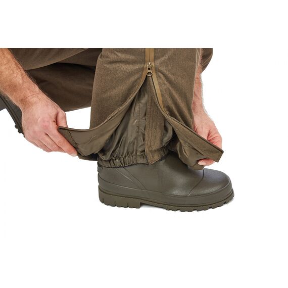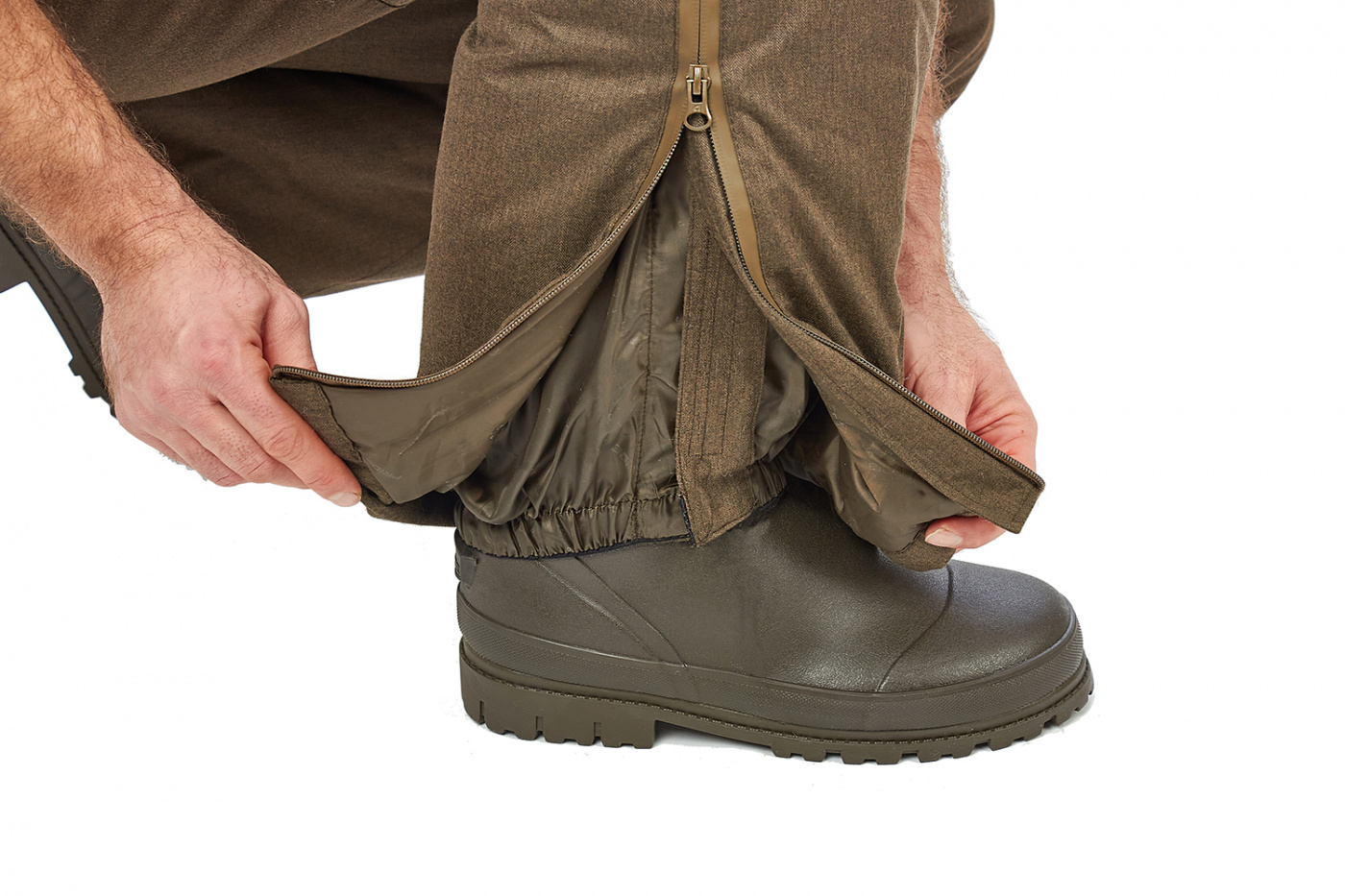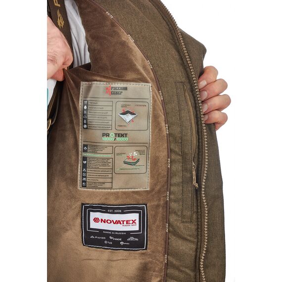 Костюм анатомического кроя, выполнен из бесшумной мембранной ткани "Бавария". Швы проклеены для защиты от влаги. В качестве подклада применяется ткань вельбоа, обеспечивающая теплоизоляцию, влагоотведение, а также комфортное применение любого термобелья и утепляющих слоев за счет своей гладкости (утепляющие слои не цепляются за подклад). Применение современных материалов позволило снизить вес костюма, что позволит охотнику меньше уставать при длительных переходах. На куртке предусмотрены карманы под рацию (для левшей и правшей). На куртке присутствует вентиляция в боковом шве. На брюках используется высокая молния с двумя бегунками, которая также выполняет роль вентиляции.
