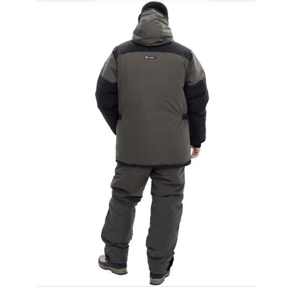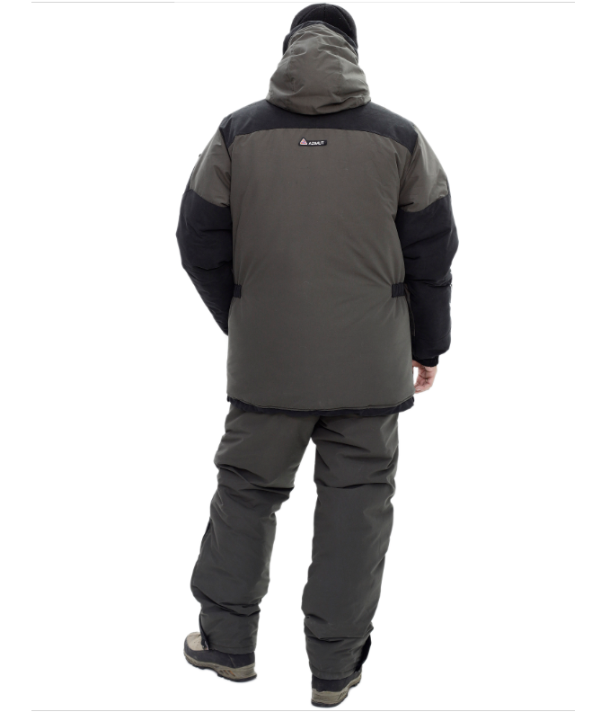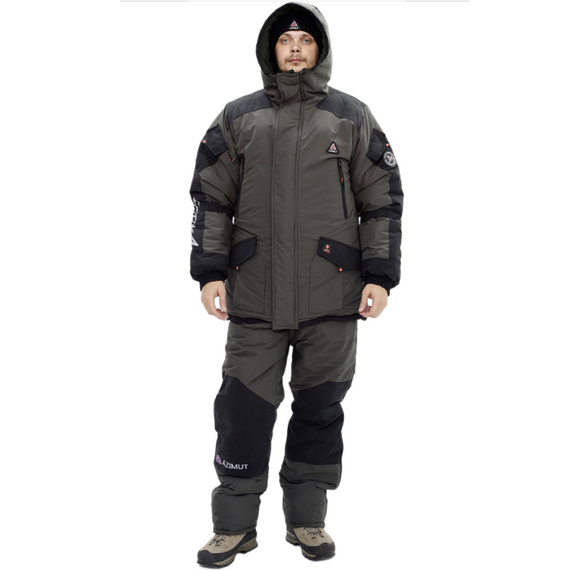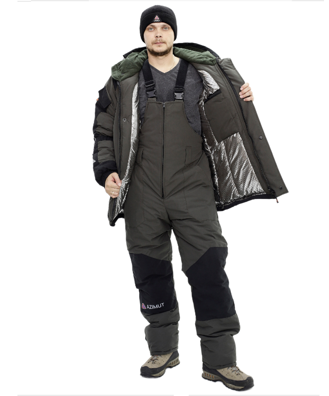 Прямая модель. Куртка три слоя утеплителя, П/К два слоя. Молния Трактор 2 бегунка. Куртка пять карманов. Утяжки ниже локтей, на талии на П/К, на ногах. Усиления на локтях, плечах и коленях. П/К два кармана. Без опушки. Капюшон не отстегивается. Подклад Hi-Tech. Низ брючин расстегивается. Температура -45С.