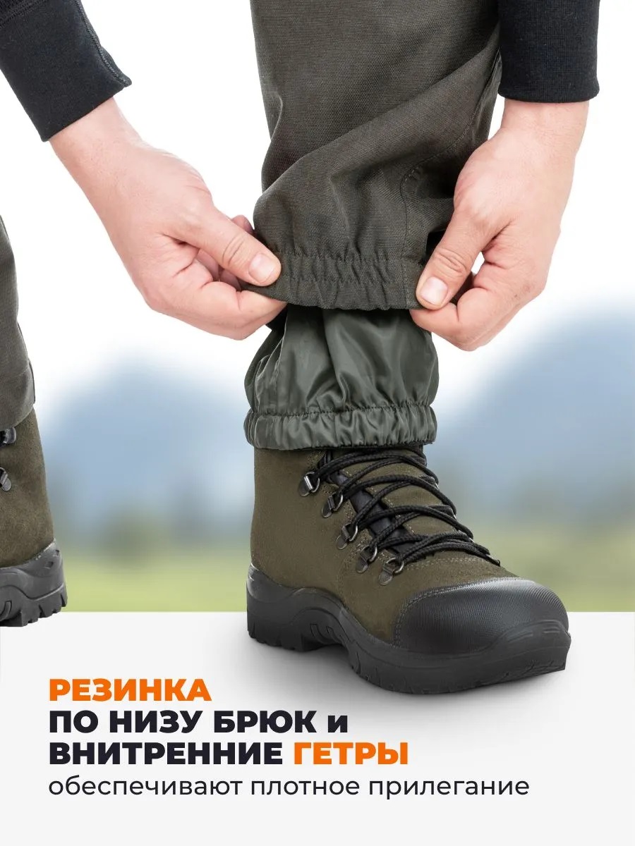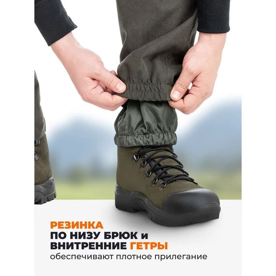 • Гетры из ткани «Барьер» с фиксацией эластичной лентой с силиконовыми полосками блокируют попадание грязи внутрь обуви и брюк.
