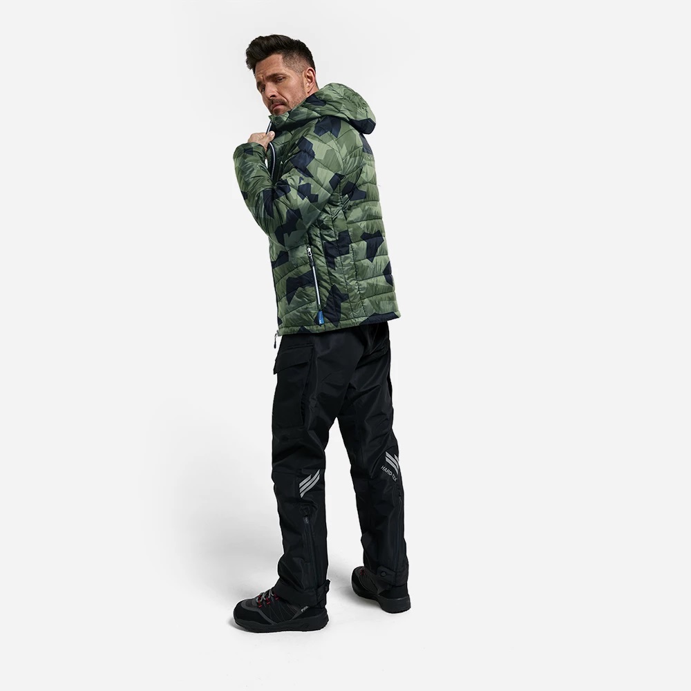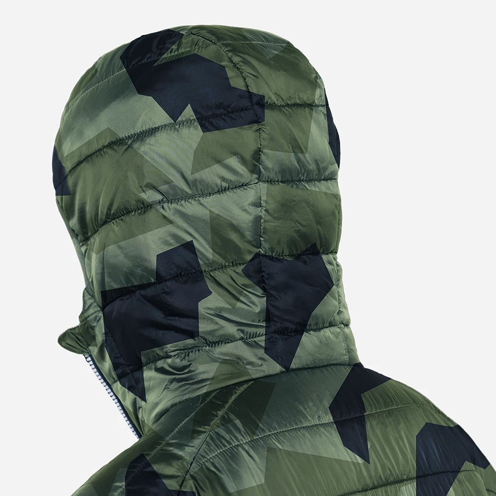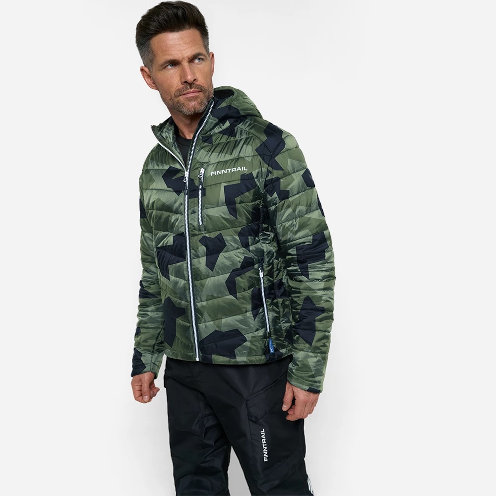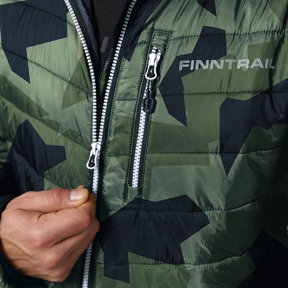 , который обеспечивает защиту от холода. Благодаря тому, что материал равномерно распределён по ячейкам, он не комкается и не собирается внизу после стирки. Внешний слой имеет водоотталкивающее покрытие, защищающее от ветра и легкого дождя. Артикулированный крой учитывает анатомию человеческого тела и обеспечивает полную свободу движений. Функциональный дизайн модели объединяет в себе продуманные детали и классическую камуфляжную расцветку. Модель имеет три кармана: два боковых и один нагрудный с тракторными молниями. Высокий воротник, внутренняя планка и эластичная лента на рукавах надёжно защищают от ветра. Дополнительная защита от холода и ветра достигается за счет эластичного ремешка, расположенного в нижней части куртки. Компактная модель легко складывается и занимает минимум места в багаже.