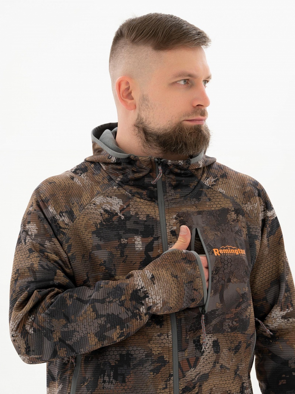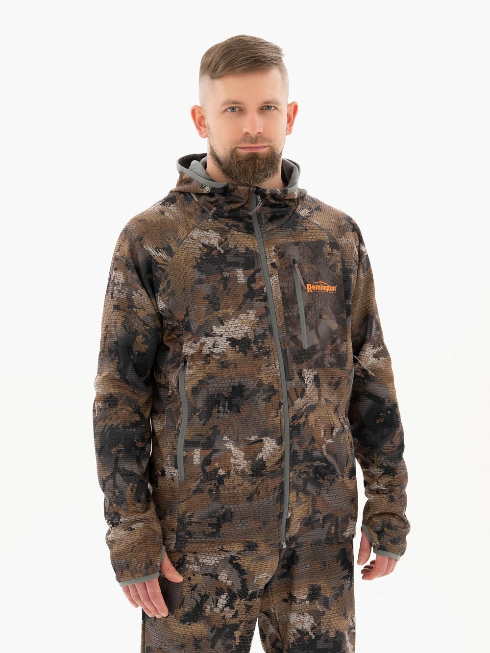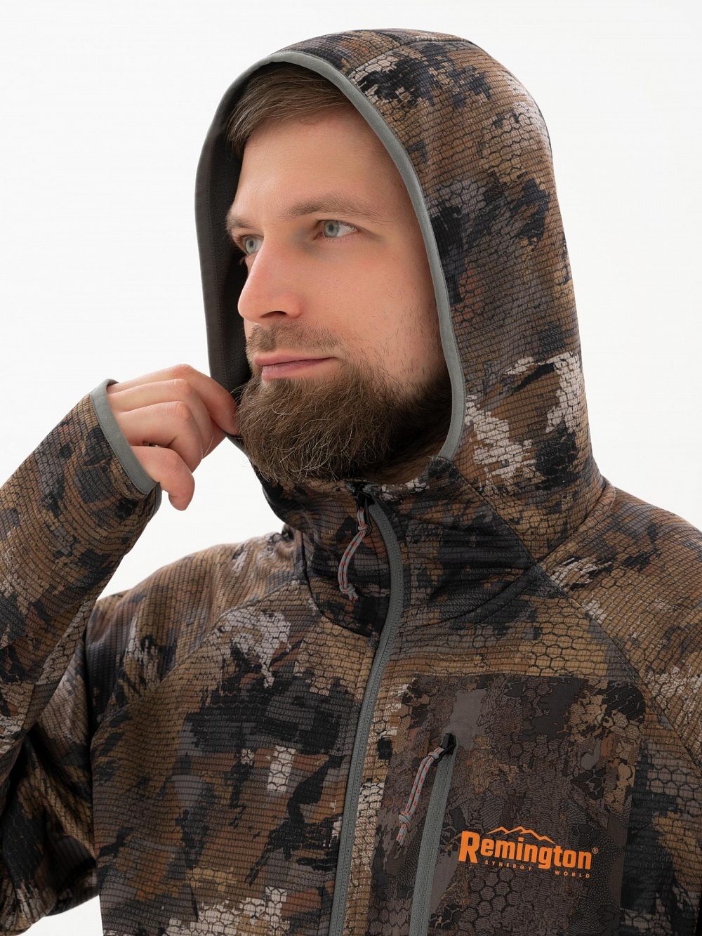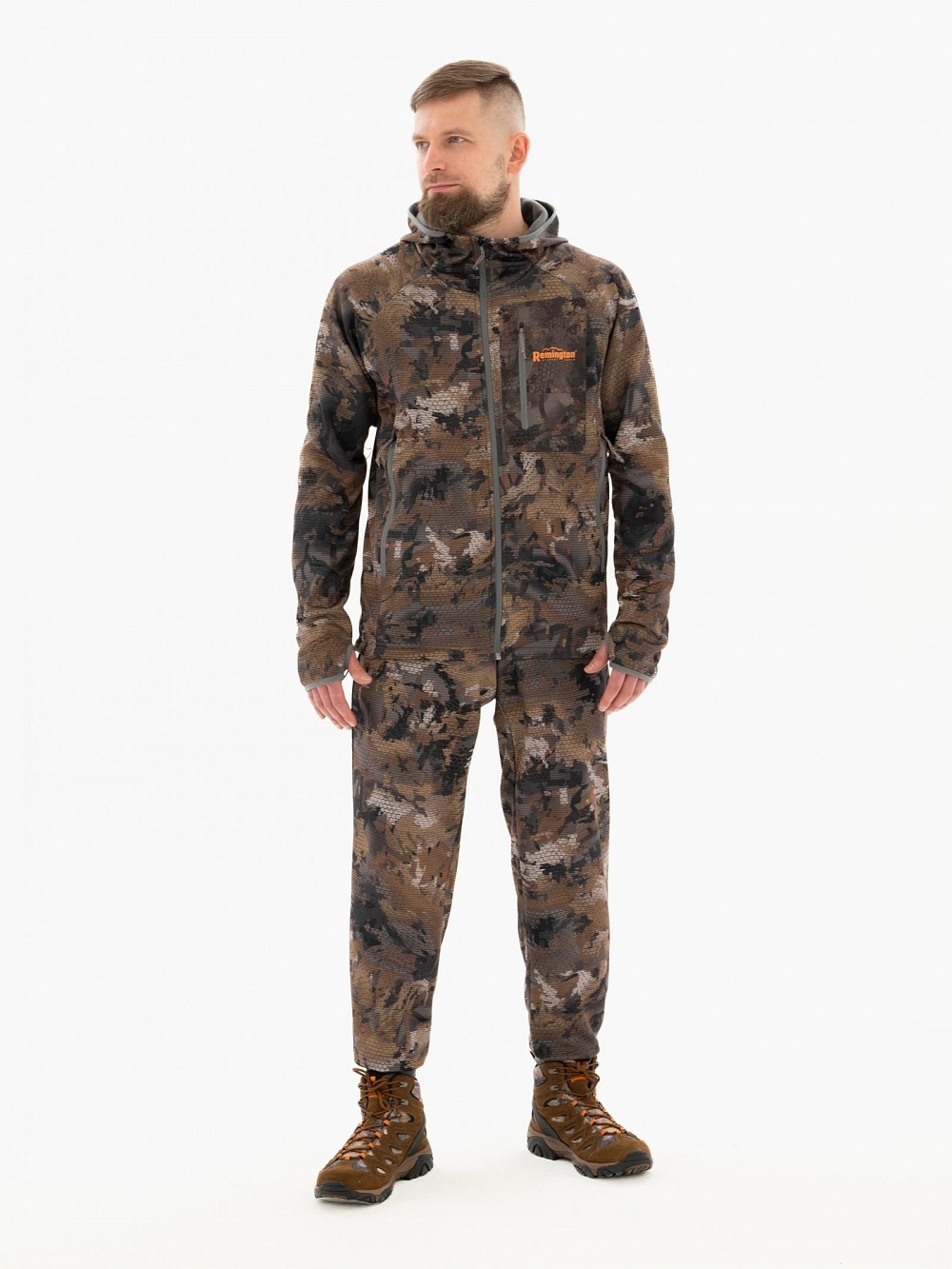 Костюм Remington Oreo Timber создан для охоты и пребывания на природе. Он изготовлен из бесшумной ткани, что помогает оставаться незаметным при передвижении. Капюшон на куртке защищает от ветра и осадков, а внутренняя ветрозащитная планка препятствует проникновению холодного воздуха. Резинка на манжетах фиксирует рукава, а отверстие под палец помогает сохранить положение рукава при движении. Кулиса по низу куртки позволяет подогнать изделие по фигуре.