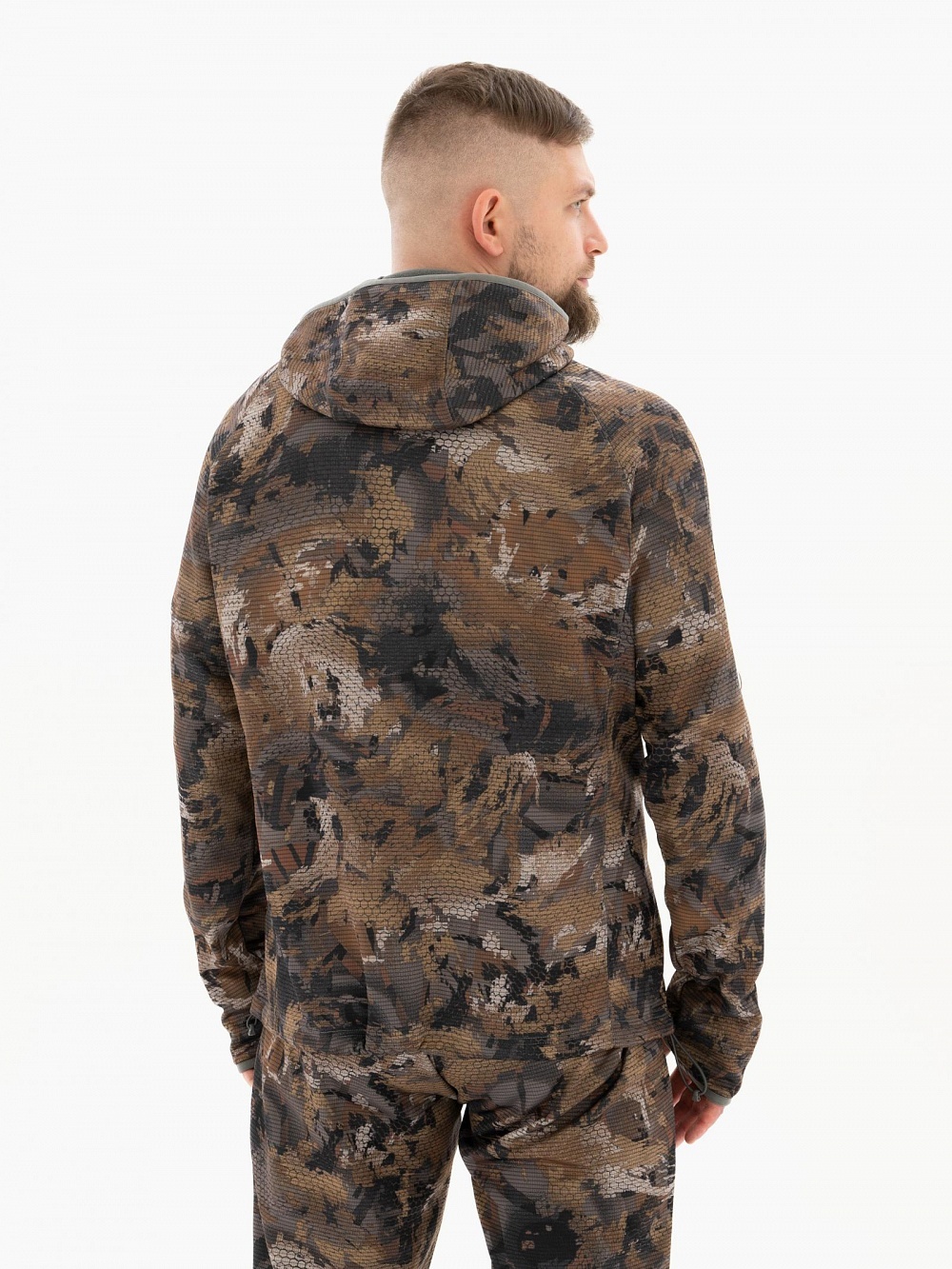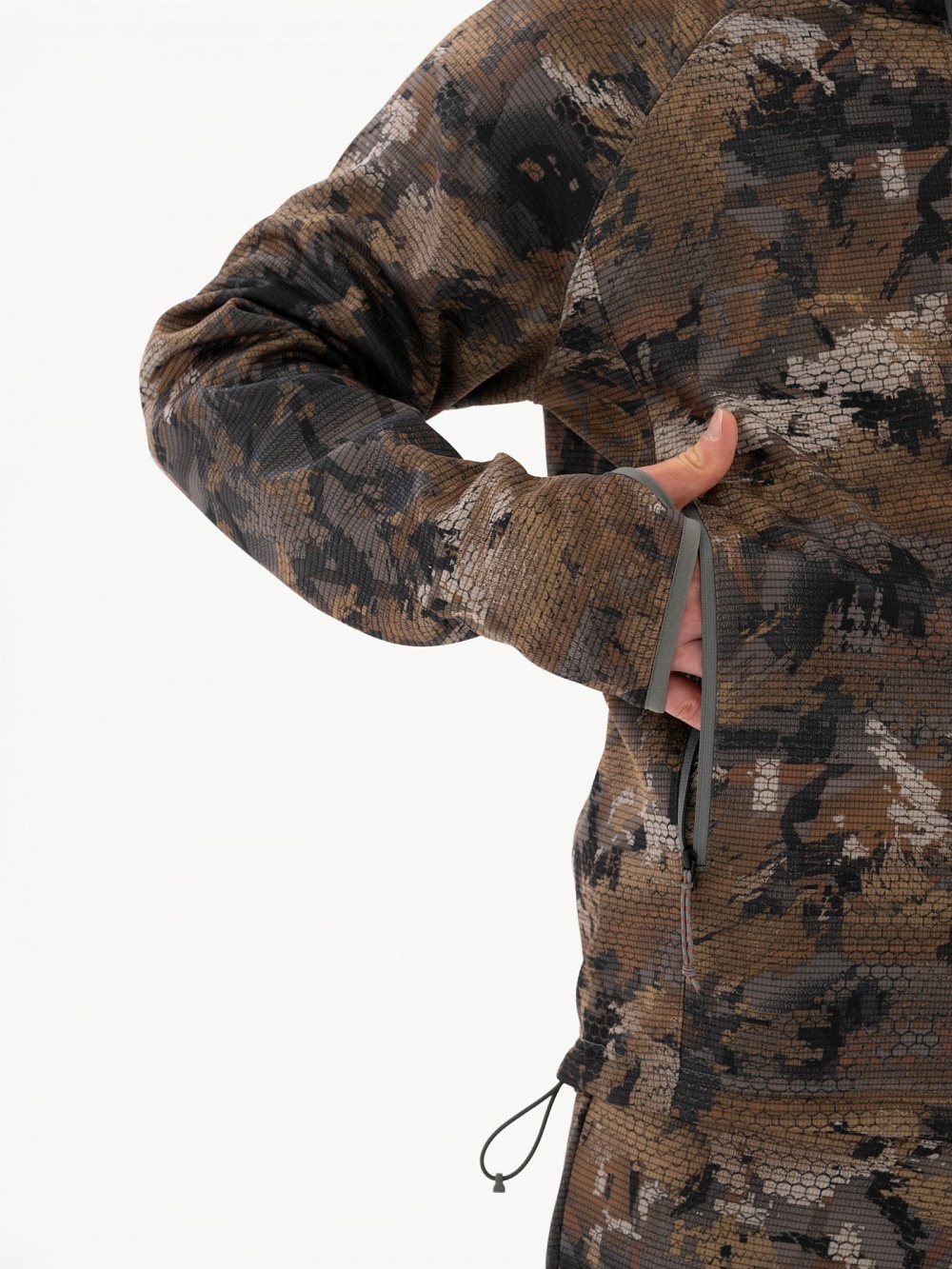 Флисовая подкладка на спине и в капюшоне сохраняет тепло. Карманы в боковых швах на куртке и брюках позволяют разместить необходимые вещи. Эластичный пояс и утягивающий шнурок обеспечивают хорошую посадку. Манжета по низу брюк защищает от пыли и ветра. Модель разработана совместно с охотниками для максимальной функциональности в полевых условиях.