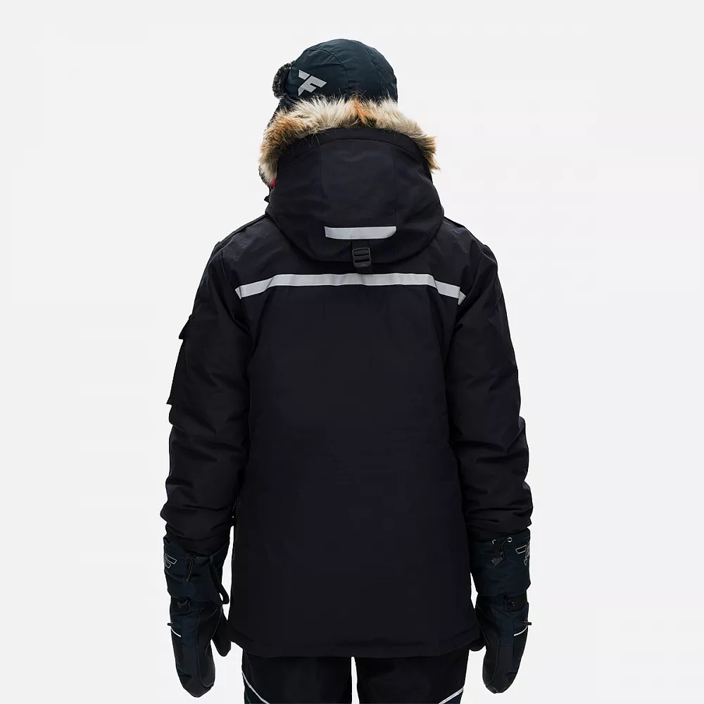 - Центральная двухзамковая тракторная молния с двумя ветрозащитными планками на велкро для 100% защиты от продувания.