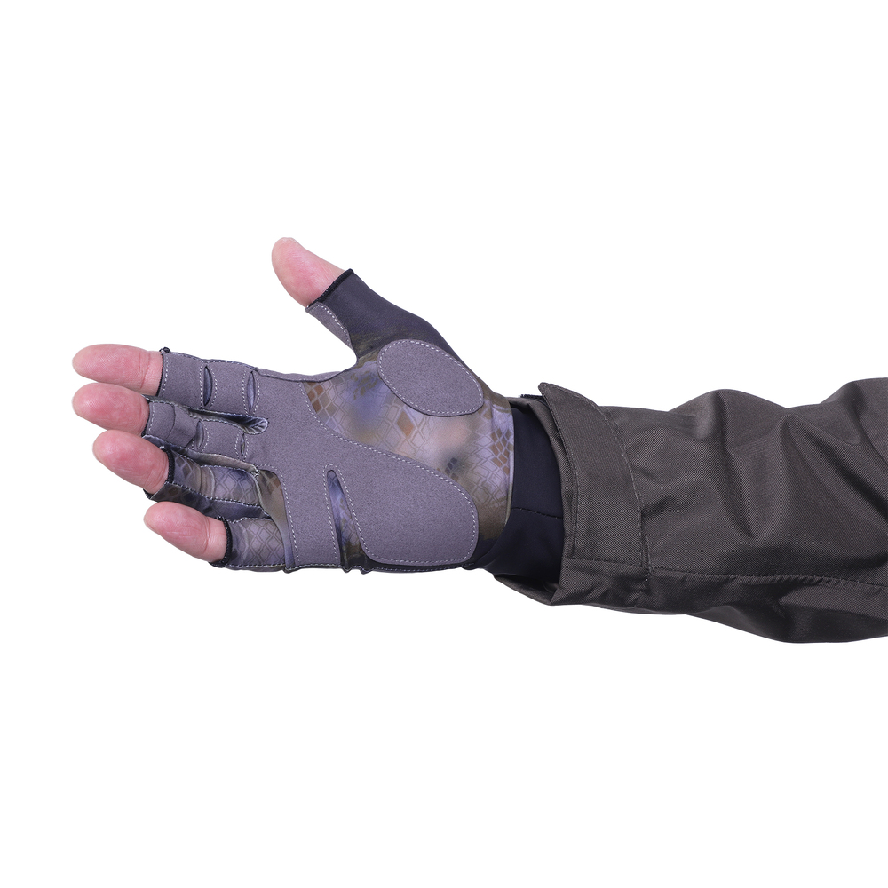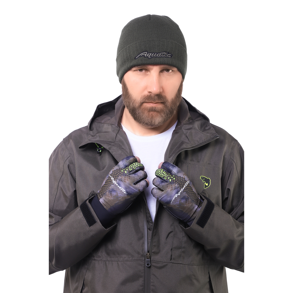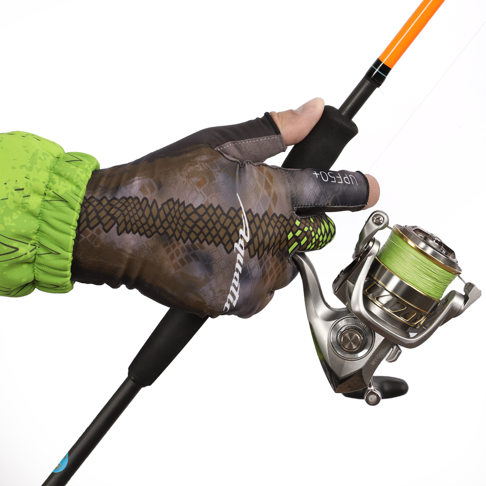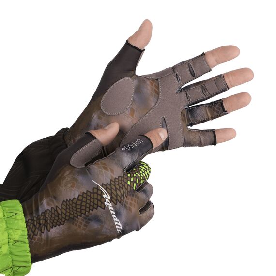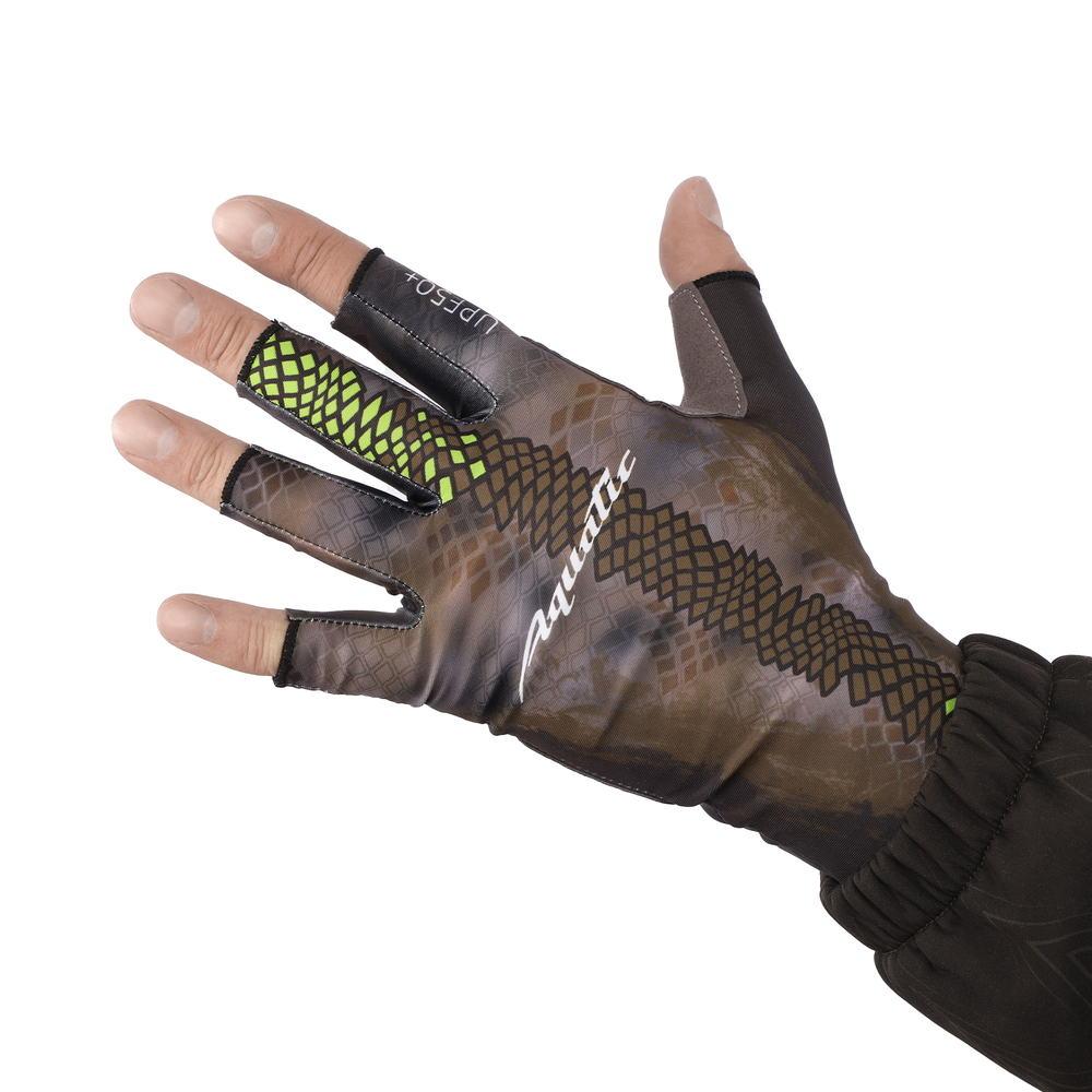 Летние перчатки для рыбалки Aquatic созданы специально для любителей активного отдыха и рыбалки. Изготовлены из Ultra Stretch — эластичной ткани из комбинации полиэстера и эластана, Ткань тянется в четырех направлениях, создавая плотную посадку. Ткань перчаток не позволит насекомым прокусить её. Высокая степень защиты от ультрафиолета UPF 50 + — блокируется 98% вредного излучения. На ладонях пришиты нескользящие кожаные вставки в местах захвата. Для удобства работы с приманками и наживками перчатки имеют обрезанные пальцы, так же предусмотрена петля на пальце для удобного снятия перчатки. Рисунок нанесен на ткань с помощью современных красок, благодаря чему он остается ярким и не тускнеет даже при частых стирках.