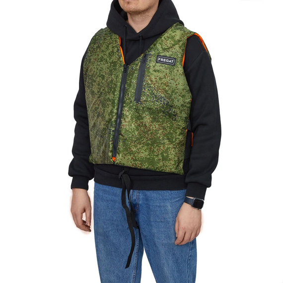 В нижней части жилета Фрегат расположен паховый ремень, он дает дополнительную гарантию безопасности: жилет не слетит с человека, упавшего в воду, даже если плохо затянут в области талии.