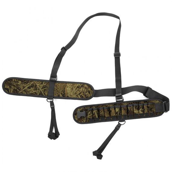 Для снижения нагрузки на пояс, патронташ имеет дополнительные стропы, которые проходят через шею и распределяют вес равномерно на плечи.
