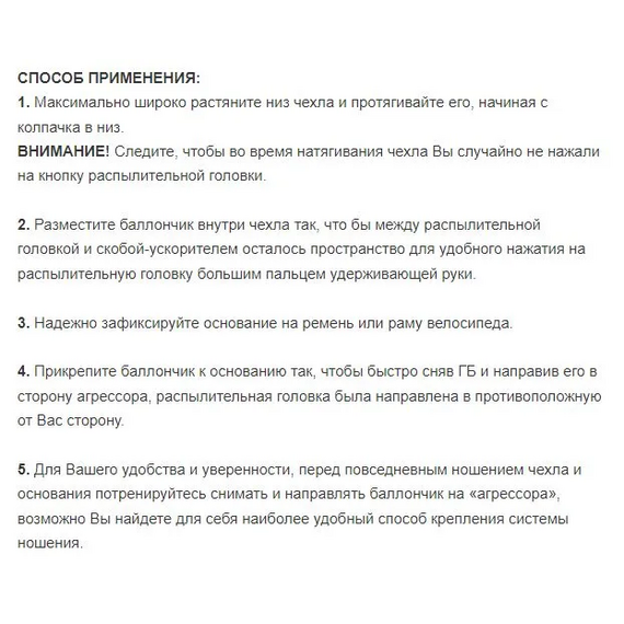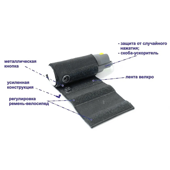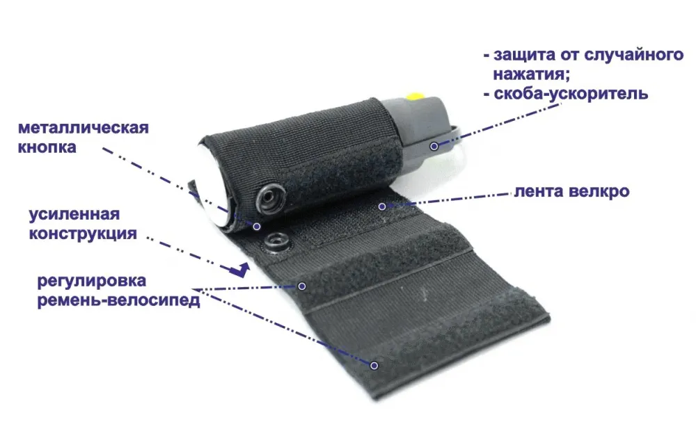 Система ношения с защитой от случайного нажатия для газовых баллончиков (ГБ) объемом 65, 75 и 100 мл состоит из эластичного чехла и универсального основания.
