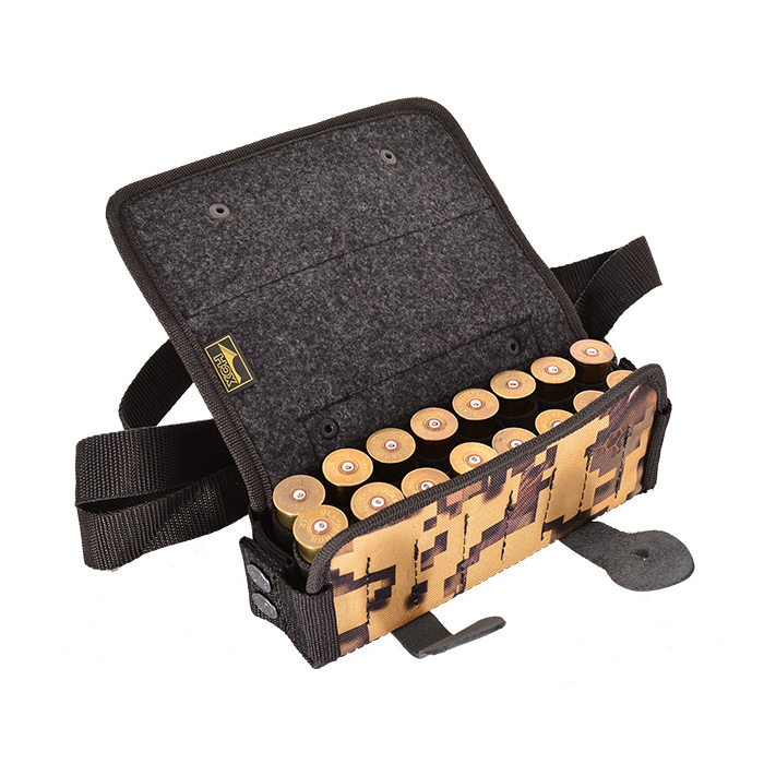 Изготовлена в традиционной форме из специальной ткани. Надежно держит 16 патронов в лузах. Позволяет загрузить патроны снаряженные в гильзы длиной от 70мм. до 89мм. Оснащена клапаном для защиты патронов от не погоды. В производстве используется итальянская фурнитура, которая практически не дает бликов. Раскрой производится на специальном оборудовании, что гарантирует высокое качество изделий.