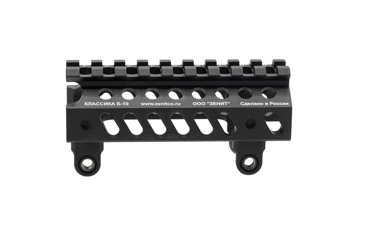 Зенит Б-19 - цельнофрезерованный алюминиевый кронштейн для коллиматорных прицелов. Размещается над газоотводной трубкой и закрепляется на цевьях того же производителя при помощи винтовых соединений.