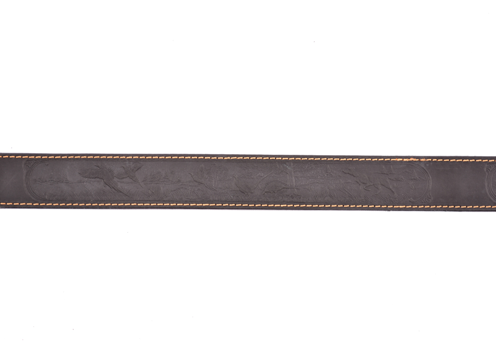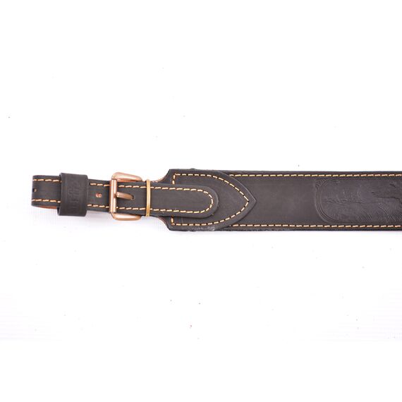 Ремень ружейный кожаный с декоративным тиснением ручной работы, двухслойный, изготовлен из высококачественной натуральной кожи повышенной толщины, прошитой в два слоя, и предназначен для переноски оружия во время охоты.