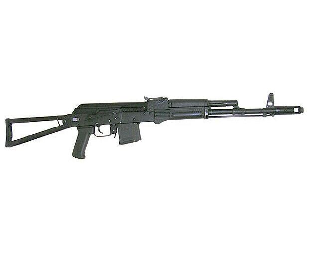 «Сайга-МК» — самозарядный нарезной карабин с рамочным металлическим прикладом, цевье и ствольная накладка выполнены из пластика, колодка мушки с дульным тормозом-компенсатором.